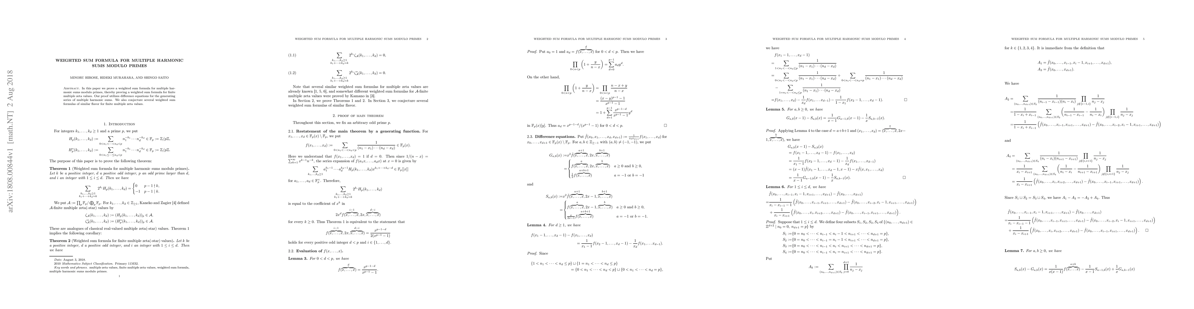 This paper establishes a weighted sum formula for multiple harmonic sums modulo primes, leveraging difference equations for their generating series, and also proposes conjectures for similar formulas for finite multiple zeta values.