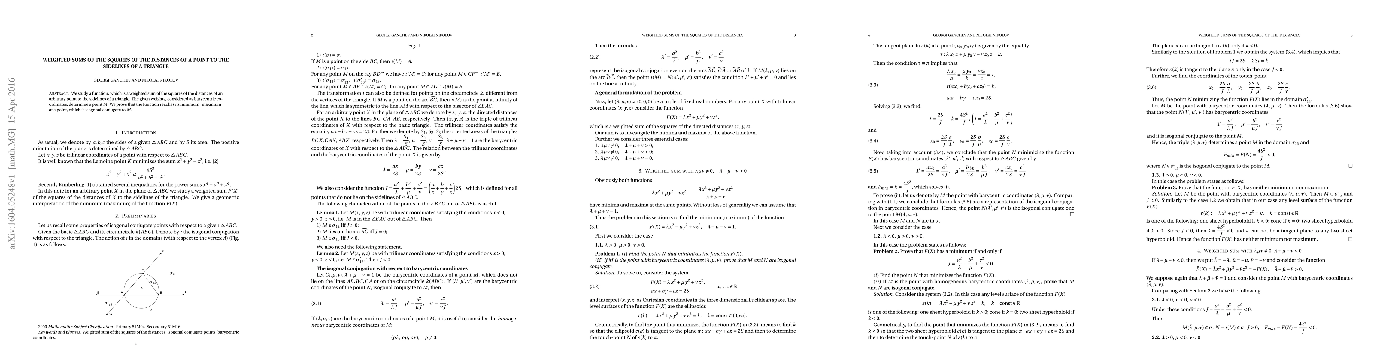This research proves that a specific weighted sum of squared distances from a point to a triangle's sides reaches its minimum or maximum at a point isogonal conjugate to a designated point M, determined by barycentric coordinates.
