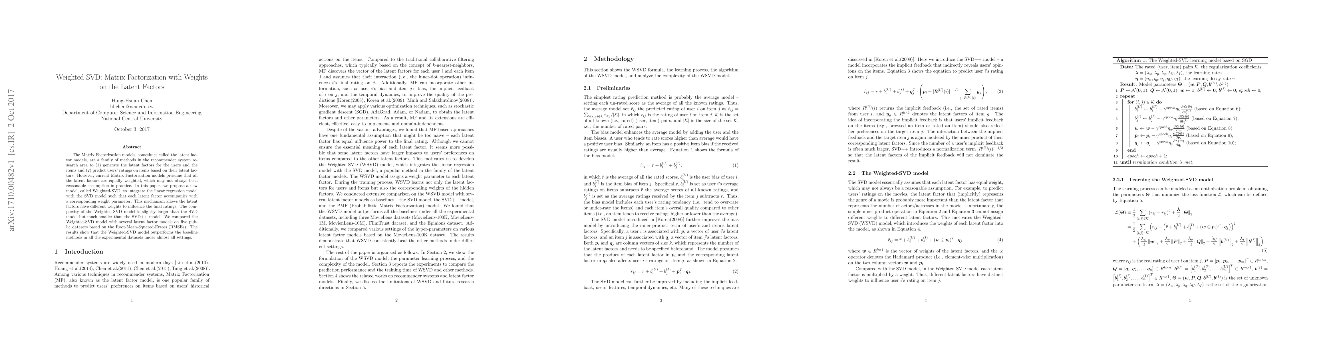 This paper proposes Weighted-SVD, a matrix factorization model that assigns weights to latent factors to better predict user ratings, outperforming baseline methods on several datasets based on RMSE. The model's complexity is higher than SVD but lower than SVD++.