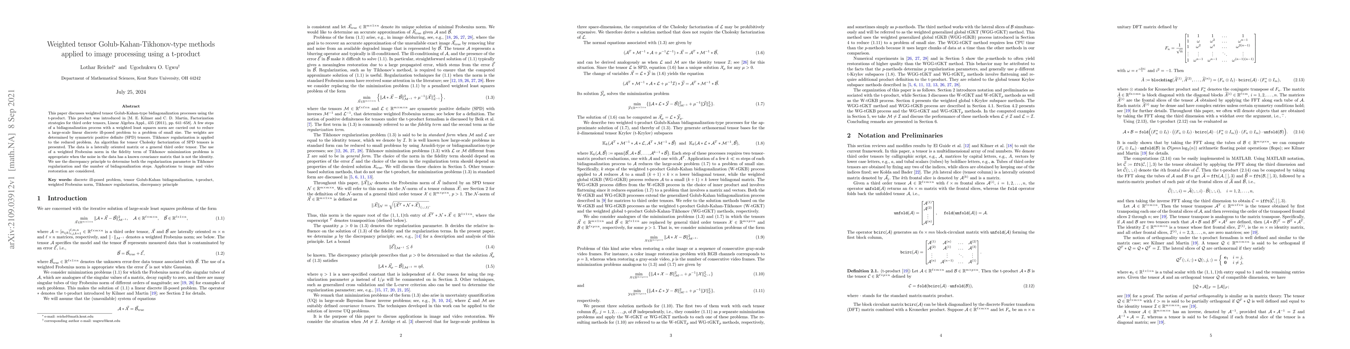 This paper discusses weighted tensor Golub-Kahan-type bidiagonalization processes using the t-product. This product was introduced in [M. E. Kilmer and C. D. Martin, Factorization strategies for third order tensors, Linear Algebra Appl., 435 (2011), pp.~641--658]. A few steps of a bidiagonalization process with a weighted least squares norm are carried out to reduce a large-scale linear discrete ill-posed problem to a problem of small size. The weights are determined by symmetric positive definite (SPD) tensors. Tikhonov regularization is applied to the reduced problem. An algorithm for tensor Cholesky factorization of SPD tensors is presented. The data is a laterally oriented matrix or a general third order tensor. The use of a weighted Frobenius norm in the fidelity term of Tikhonov minimization problems is appropriate when the noise in the data has a known covariance matrix that is not the identity. We use the discrepancy principle to determine both the regularization parameter in Tikhonov regularization and the number of bidiagonalization steps. Applications to image and video restoration are considered.