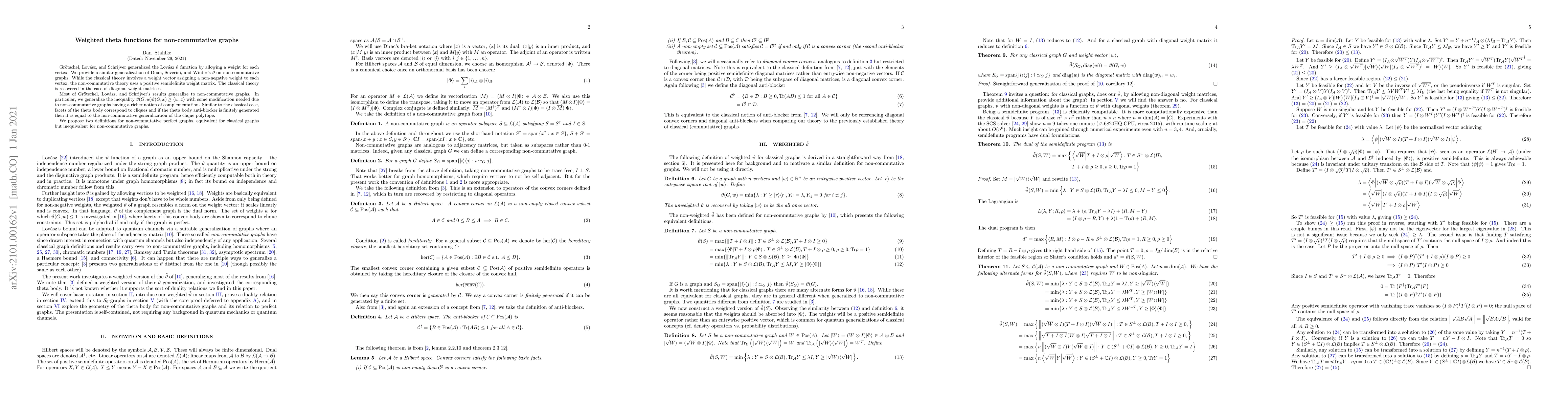 This paper generalizes weighted theta functions for non-commutative graphs using positive semidefinite weight matrices, extending classical theories. It recovers classical results for diagonal weight matrices and proposes two definitions for non-commutative perfect graphs.