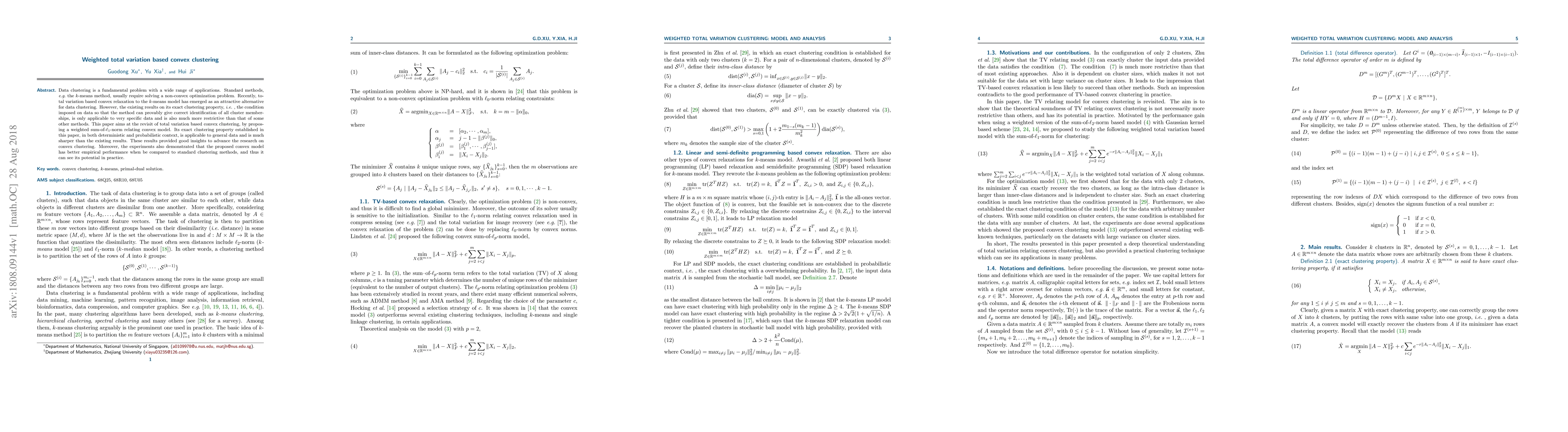 This paper proposes a weighted total variation based convex clustering model that improves the exact clustering property for general data compared to existing methods. The new model demonstrates better empirical performance in experiments, suggesting potential practical applications.