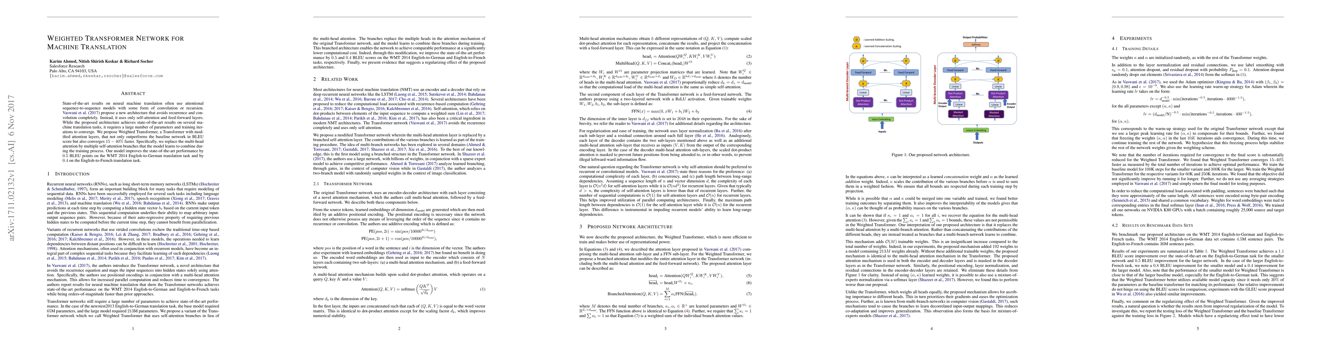 The paper proposes a Weighted Transformer network that enhances the standard Transformer model by using self-attention branches instead of multi-head attention, achieving better performance and faster convergence. The model improves BLEU scores by 0.5 points on English-to-German and 0.4 on English-to-French translations.