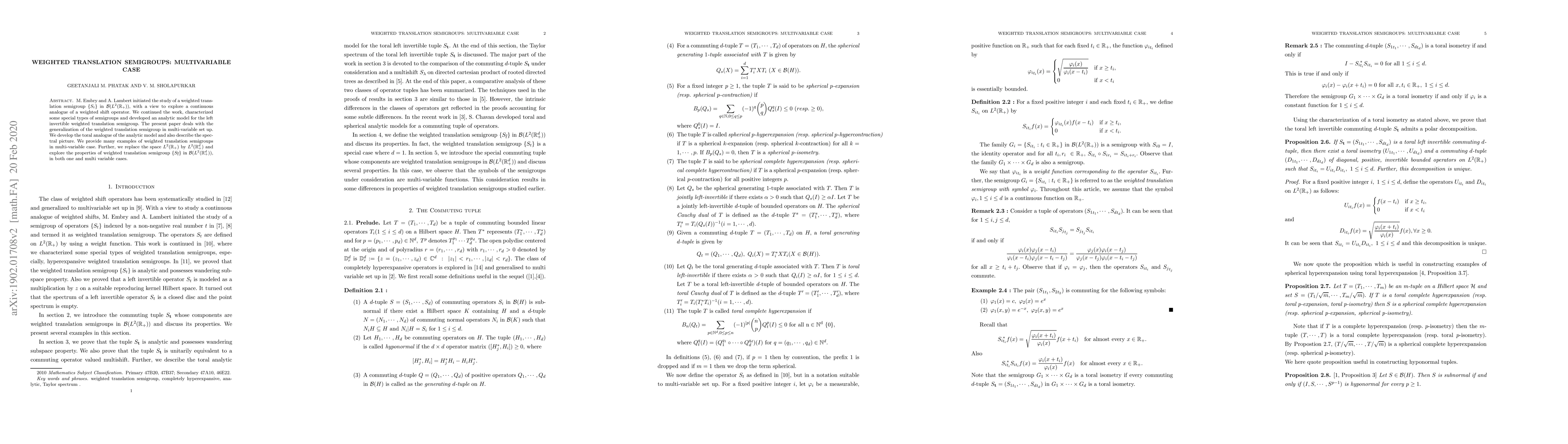 M. Embry and A. Lambert initiated the study of a weighted translation semigroup $\{S_t\}$ in ${\cal B}(L^2({\mathbb R_+})),$ with a view to explore a continuous analogue of a weighted shift operator. We continued the work, characterized some special types of semigroups and developed an analytic model for the left invertible weighted translation semigroup. The present paper deals with the generalization of the weighted translation semigroup in multi-variable set up. We develop the toral analogue of the analytic model and also describe the spectral picture. We provide many examples of weighted translation semigroups in multi-variable case. Further, we replace the space $L^2({\mathbb R_+})$ by $L^2({\mathbb R_+^d})$ and explore the properties of weighted translation semigroup $\{S_{\bar{t}}\}$ in ${\cal B}(L^2({\mathbb R_+^d})),$ in both one and multi variable cases.