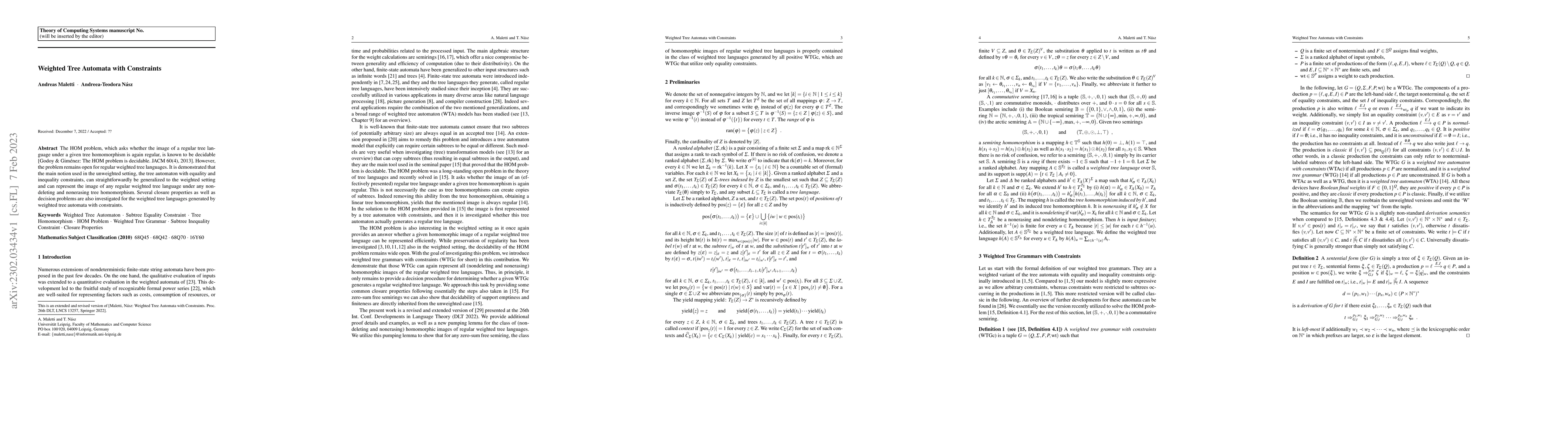 The paper investigates the generalization of tree automata with constraints to weighted tree languages, demonstrating their ability to represent the image of such languages under tree homomorphisms. It also examines closure properties and decision problems for these weighted tree languages.