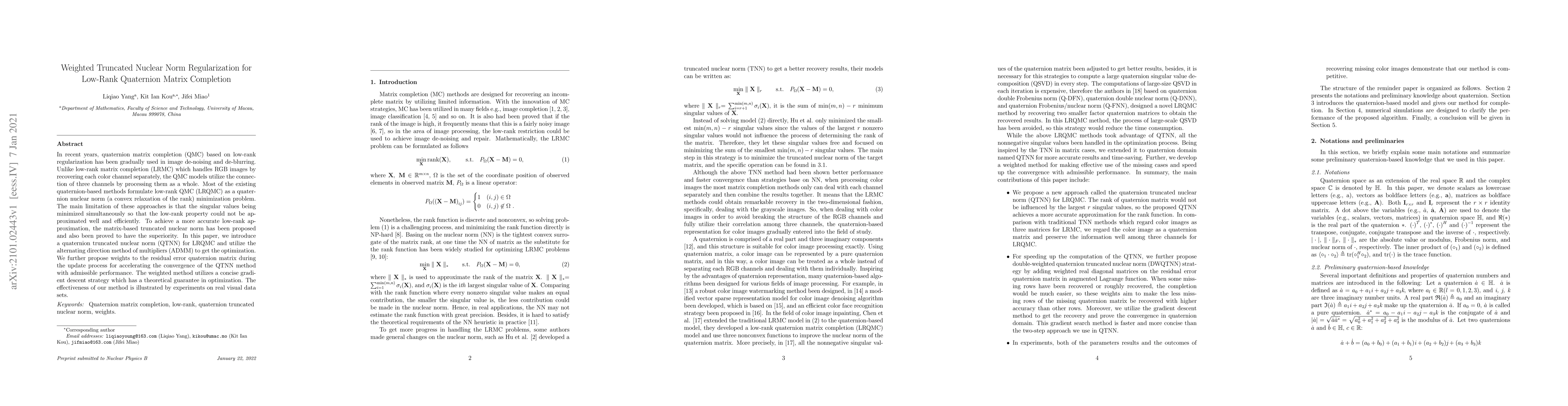 This paper proposes a weighted truncated nuclear norm regularization for low-rank quaternion matrix completion (LRQMC) to improve image de-noising and de-blurring. The method introduces a quaternion truncated nuclear norm (QTNN) and utilizes the alternating direction method of multipliers (ADMM) with weighted updates to achieve faster convergence and better low-rank approximation.