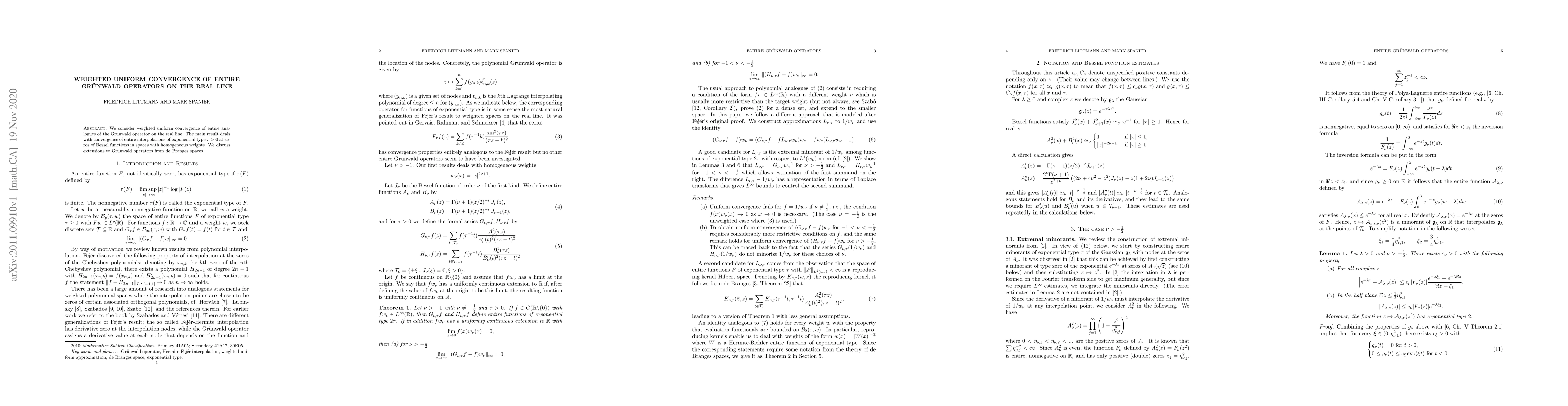 Summary: This paper explores the weighted uniform convergence of entire Grünwald operators on the real line, focusing on the convergence of entire interpolations of exponential type at zeros of Bessel functions within spaces with homogeneous weights, and extends these findings to Grünwald operators from de Branges spaces.