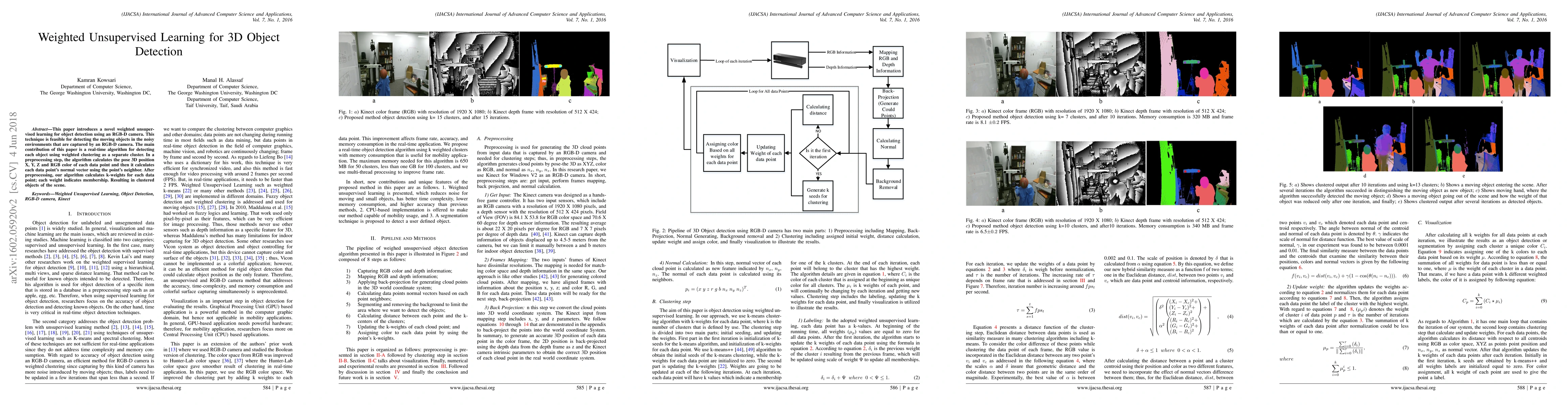 This paper introduces a novel weighted unsupervised learning approach for 3D object detection using RGB-D cameras, allowing real-time detection in noisy environments.
