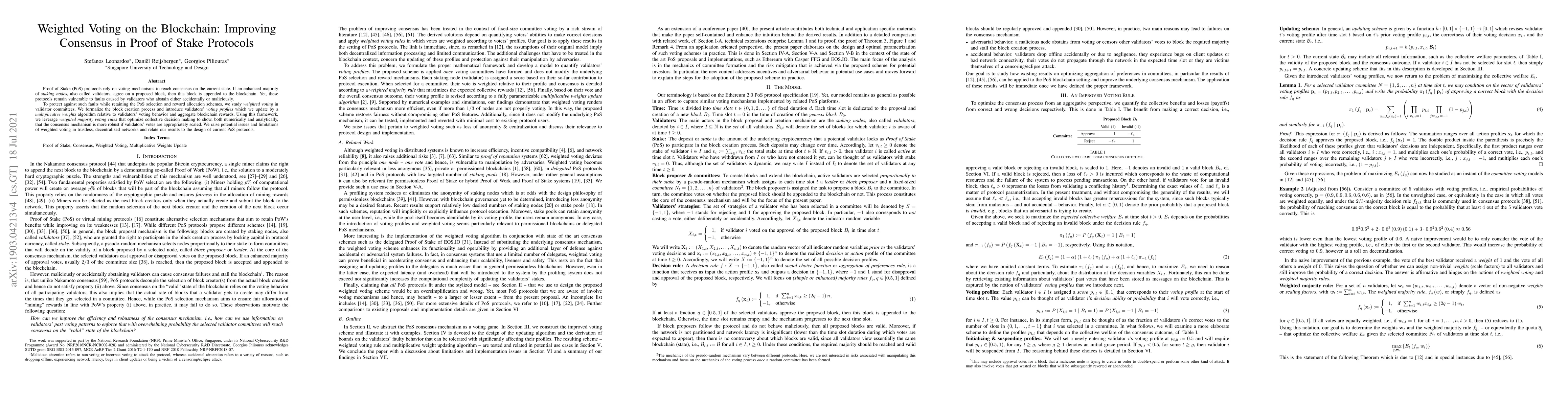 Proof of Stake (PoS) protocols rely on voting mechanisms to reach consensus on the current state. If an enhanced majority of staking nodes, also called validators, agree on a proposed block, then this block is appended to the blockchain. Yet, these protocols remain vulnerable to faults caused by validators who abstain either accidentally or maliciously. To protect against such faults while retaining the PoS selection and reward allocation schemes, we study weighted voting in validator committees. We formalize the block creation process and introduce validators' voting profiles which we update by a multiplicative weights algorithm relative to validators' voting behavior and aggregate blockchain rewards. Using this framework, we leverage weighted majority voting rules that optimize collective decision making to show, both numerically and analytically, that the consensus mechanism is more robust if validators' votes are appropriately scaled. We raise potential issues and limitations of weighted voting in trustless, decentralized networks and relate our results to the design of current PoS protocols.