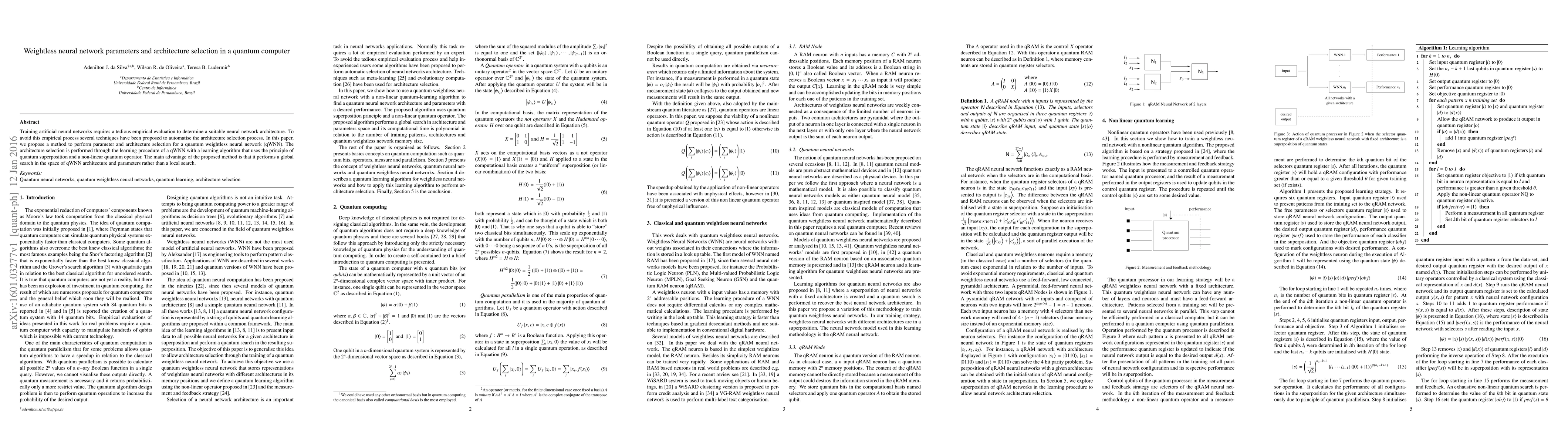 This paper proposes a method for automating the selection of parameters and architecture for quantum weightless neural networks (qWNN) using quantum superposition and a non-linear quantum operator, enabling a global search rather than a local search. The approach aims to eliminate the need for tedious empirical evaluation in training.
