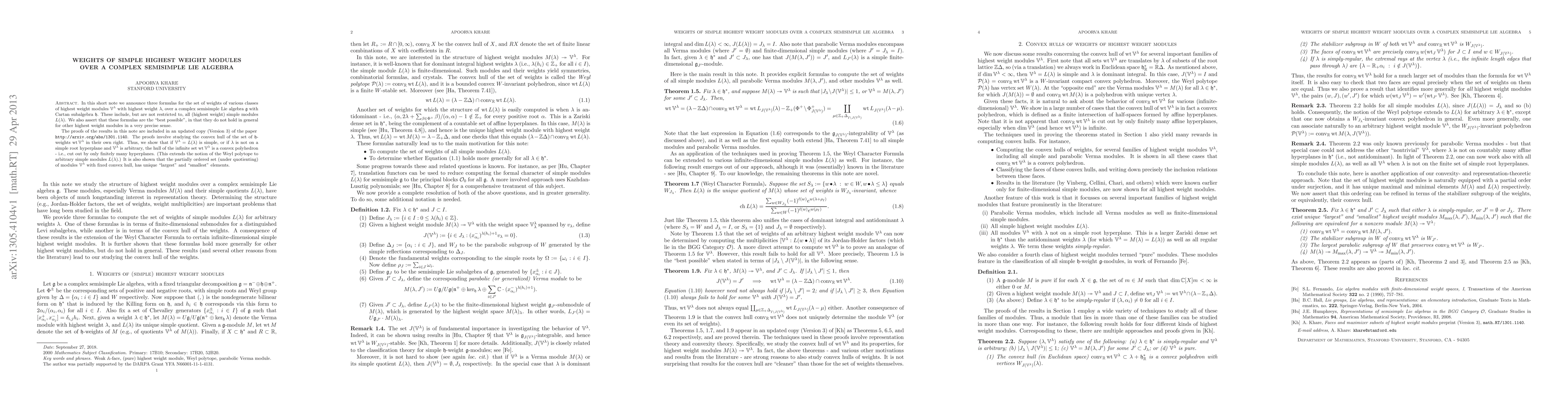 In this short note we announce three formulas for the set of weights of various classes of highest weight modules $\V$ with highest weight \lambda, over a complex semisimple Lie algebra $\lie{g}$ with Cartan subalgebra $\lie{h}$. These include, but are not restricted to, all (highest weight) simple modules L(\lambda). We also assert that these formulas are the "best possible", in that they do not hold in general for other highest weight modules in a very precise sense. The proofs of the results in this note are included in an updated copy (Version 3) of the paper arxiv:1301.1140 . The proofs involve studying the convex hull of the set of $\lie{h}$-weights $\wt(\V)$ in their own right. Thus, we show that if $\V = L(\lambda)$ is simple, or if \lambda\ is not on a simple root hyperplane and $\V$ is arbitrary, the hull of the infinite set $\wt(\V)$ is a convex polyhedron - i.e., cut out by only finitely many hyperplanes. (This extends the notion of the Weyl polytope to arbitrary simple modules L(\lambda).) It is also shown that the partially ordered set (under quotienting) of modules $\V$ with fixed convex hull, has unique "largest" and "smallest" elements.