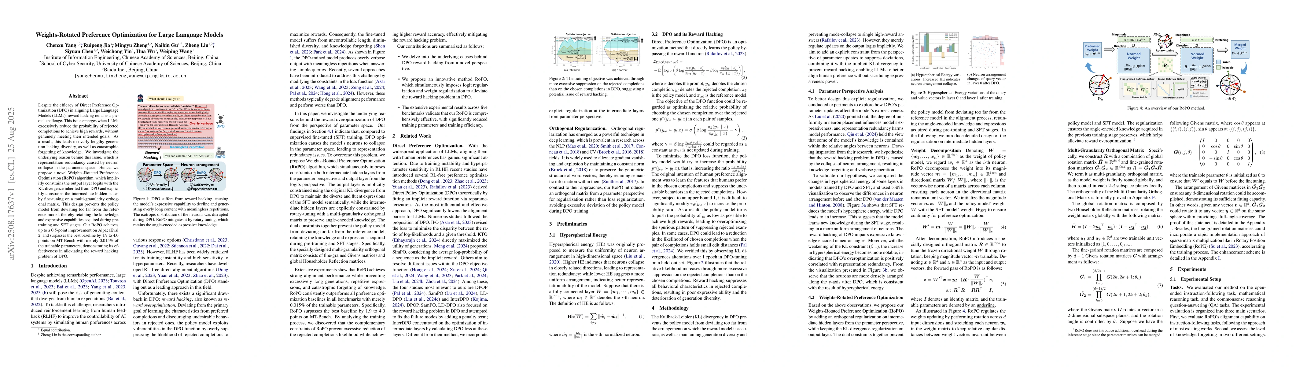 Despite the efficacy of Direct Preference Optimization (DPO) in aligning Large Language Models (LLMs), reward hacking remains a pivotal challenge. This issue emerges when LLMs excessively reduce the probability of rejected completions to achieve high rewards, without genuinely meeting their intended goals. As a result, this leads to overly lengthy generation lacking diversity, as well as catastrophic forgetting of knowledge. We investigate the underlying reason behind this issue, which is representation redundancy caused by neuron collapse in the parameter space. Hence, we propose a novel Weights-Rotated Preference Optimization (RoPO) algorithm, which implicitly constrains the output layer logits with the KL divergence inherited from DPO and explicitly constrains the intermediate hidden states by fine-tuning on a multi-granularity orthogonal matrix. This design prevents the policy model from deviating too far from the reference model, thereby retaining the knowledge and expressive capabilities acquired during pre-training and SFT stages. Our RoPO achieves up to a 3.27-point improvement on AlpacaEval 2, and surpasses the best baseline by 6.2 to 7.5 points on MT-Bench with merely 0.015% of the trainable parameters, demonstrating its effectiveness in alleviating the reward hacking problem of DPO.