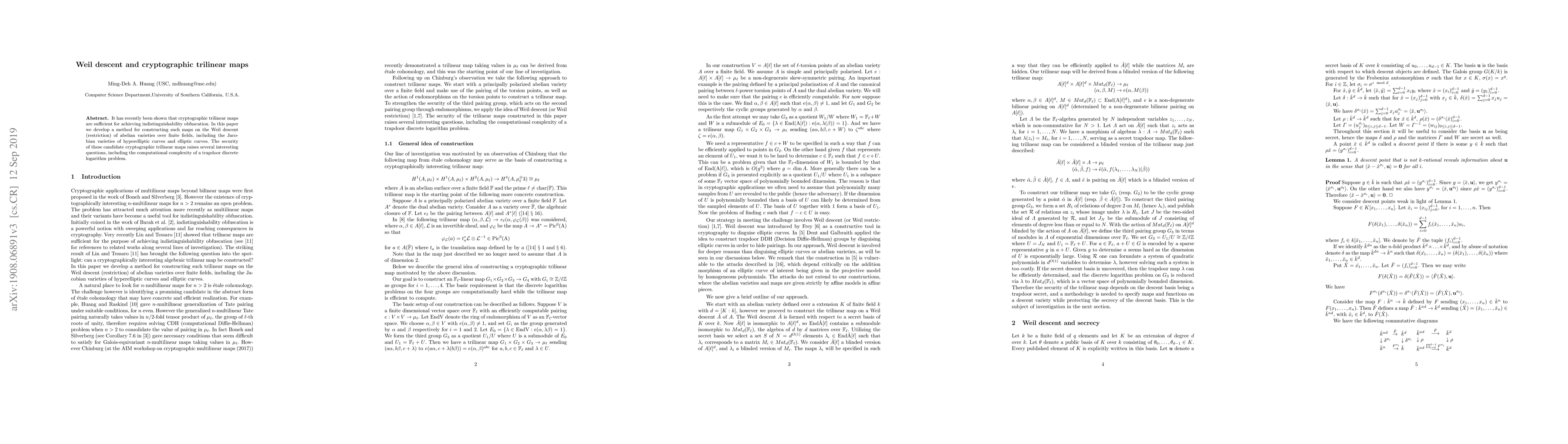 The paper develops a method for constructing cryptographic trilinear maps on the Weil descent of abelian varieties, including Jacobian varieties of hyperelliptic curves and elliptic curves, using Weil descent (restriction).