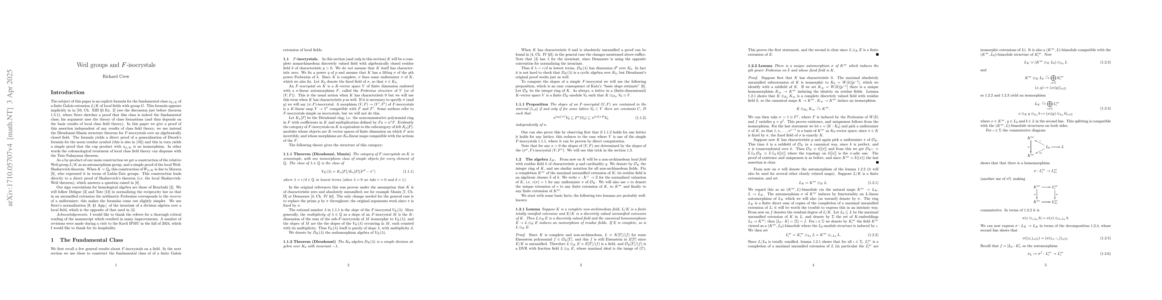 We show that much of local class theory can be deduced from the Dieudonn\'e-Manin structure theory for $F$-isocrystals on an algebraically closed field of characteristic $p>0$. As a consequence we get a new proof of a formula of Dwork for the norm residue symbol, as well as a "constructive" proof of the local Shafarevich-Weil theorem. This last answers a question of Morava.