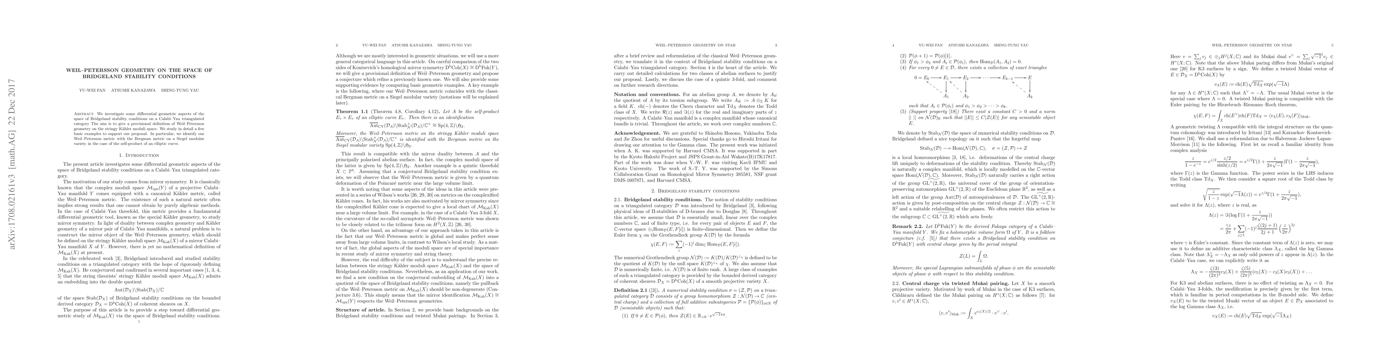This paper explores the differential geometric properties of Bridgeland stability conditions on Calabi-Yau triangulated categories, aiming to develop a Weil-Petersson geometry theory on the stringy Kähler moduli space. It identifies the Weil-Petersson metric with the Bergman metric in the case of an elliptic curve's self-product.