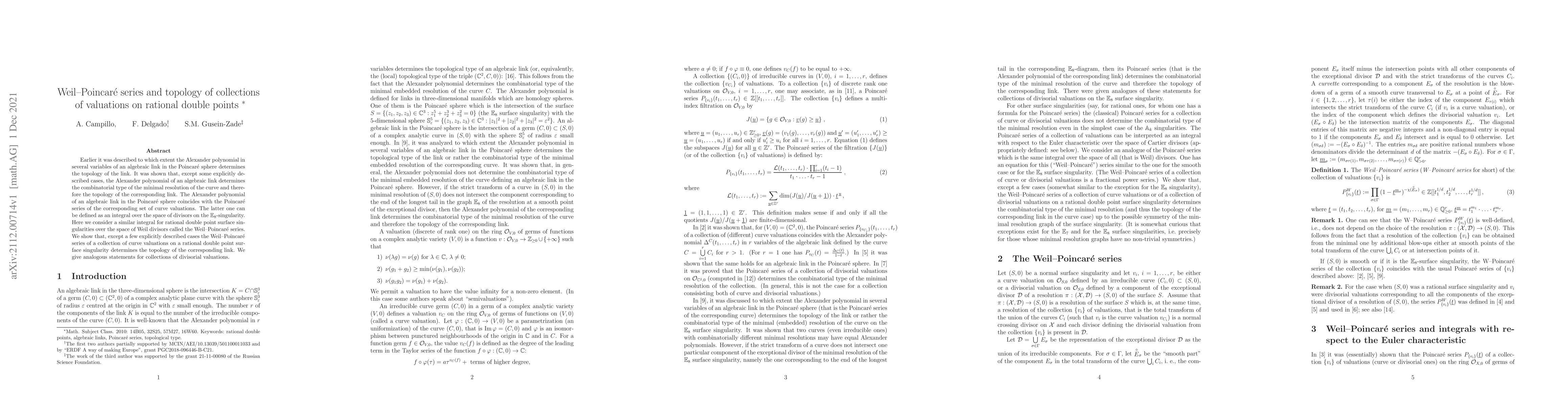 Earlier it was described to which extent the Alexander polynomial in several variables of an algebraic link in the Poincar\'e sphere determines the topology of the link. It was shown that, except some explicitly described cases, the Alexander polynomial of an algebraic link determines the combinatorial type of the minimal resolution of the curve and therefore the topology of the corresponding link. The Alexander polynomial of an algebraic link in the Poincar\'e sphere coincides with the Poincar\'e series of the corresponding set of curve valuations. The latter one can be defined as an integral over the space of divisors on the $E_8$-singularity. Here we consider a similar integral for rational double point surface singularities over the space of Weil divisors called the Weil-Poincar\'e series. We show that, except a few explicitly described cases the Weil-Poincar\'e series of a collection of curve valuations on a rational double point surface singularity determines the topology of the corresponding link. We give analogous statements for collections of divisorial valuations.
