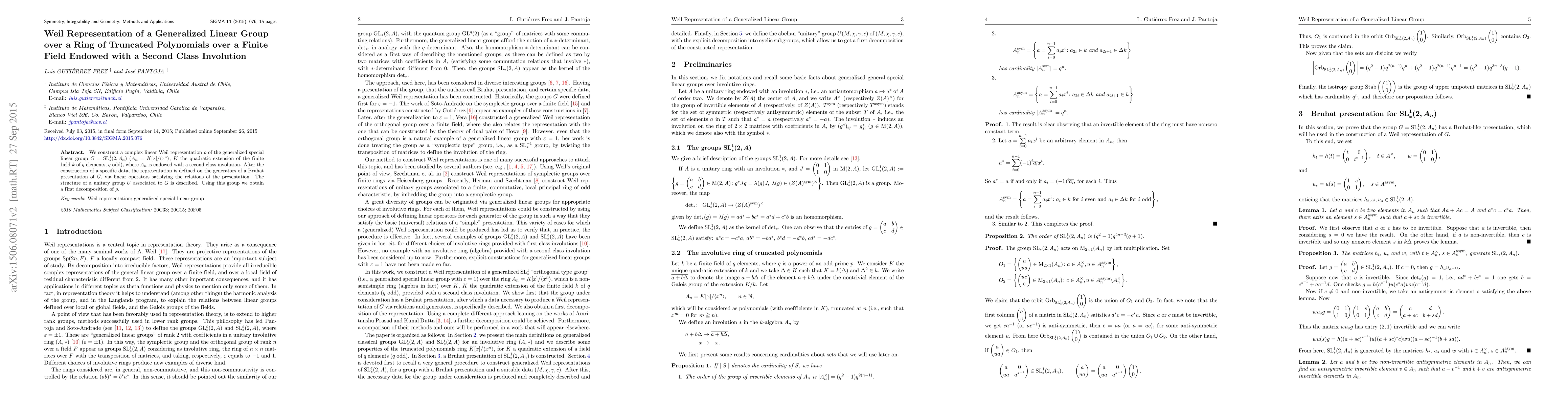 We construct a complex linear Weil representation $\rho$ of the generalized special linear group $G={\rm SL}_*^{1}(2,A_n)$ ($A_n=K[x]/\langle x^n\rangle$, $K$ the quadratic extension of the finite field $k$ of $q$ elements, $q$ odd), where $A_n$ is endowed with a second class involution. After the construction of a specific data, the representation is defined on the generators of a Bruhat presentation of $G$, via linear operators satisfying the relations of the presentation. The structure of a unitary group $U$ associated to $G$ is described. Using this group we obtain a first decomposition of $\rho$.