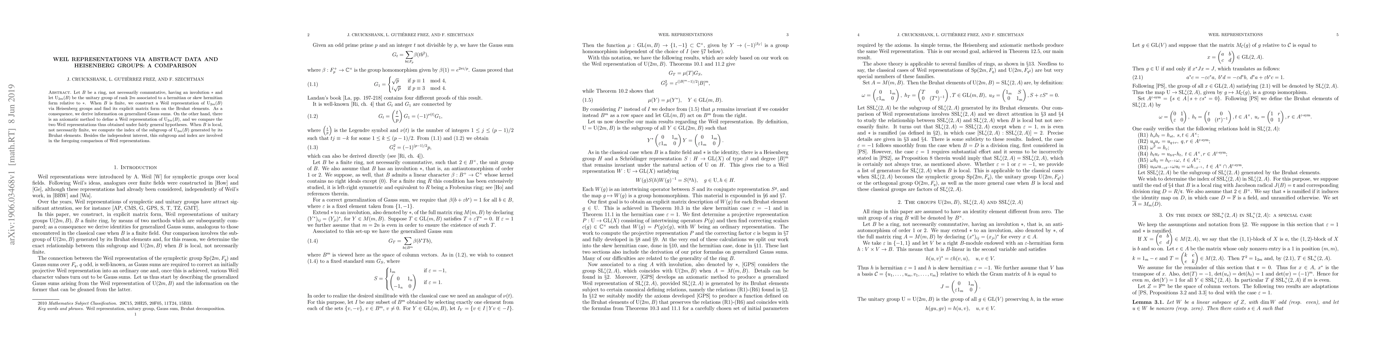 Let $B$ be a ring, not necessarily commutative, having an involution $*$ and let ${\mathrm U}_{2m}(B)$ be the unitary group of rank $2m$ associated to a hermitian or skew hermitian form relative to $*$. When $B$ is finite, we construct a Weil representation of ${\mathrm U}_{2m}(B)$ via Heisenberg groups and find its explicit matrix form on the Bruhat elements. As a consequence, we derive information on generalized Gauss sums. On the other hand, there is an axiomatic method to define a Weil representation of ${\mathrm U}_{2m}(B)$, and we compare the two Weil representations thus obtained under fairly general hypotheses. When $B$ is local, not necessarily finite, we compute the index of the subgroup of ${\mathrm U}_{2m}(B)$ generated by its Bruhat elements. Besides the independent interest, this subgroup and index are involved in the foregoing comparison of Weil representations.