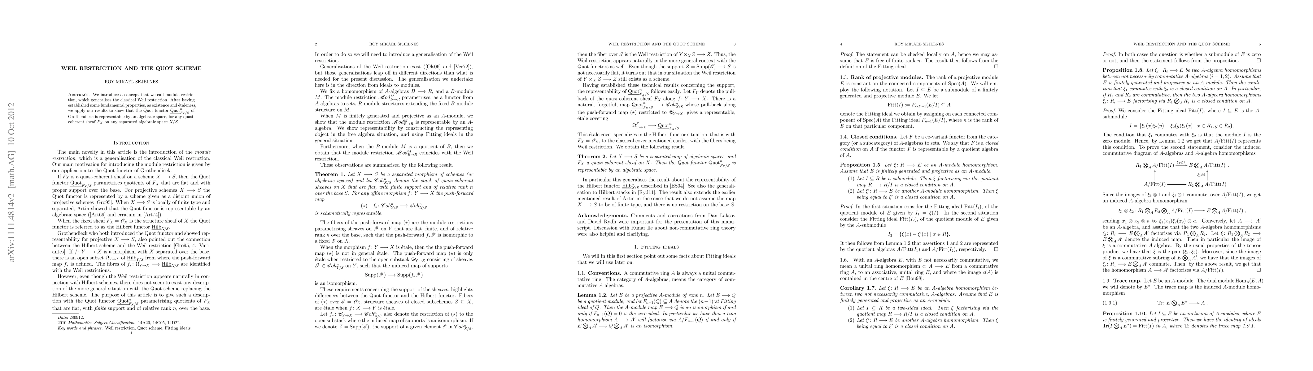 We introduce a concept that we call module restriction, which generalizes the classical Weil restriction. We first establish some fundamental properties, as existence and \'etaleness. Then we apply our results to show that Grothendiecks Quot functor parameterizing finite and flat quotients of a given quasi-coherent sheaf on a separated algebraic space, is representable.