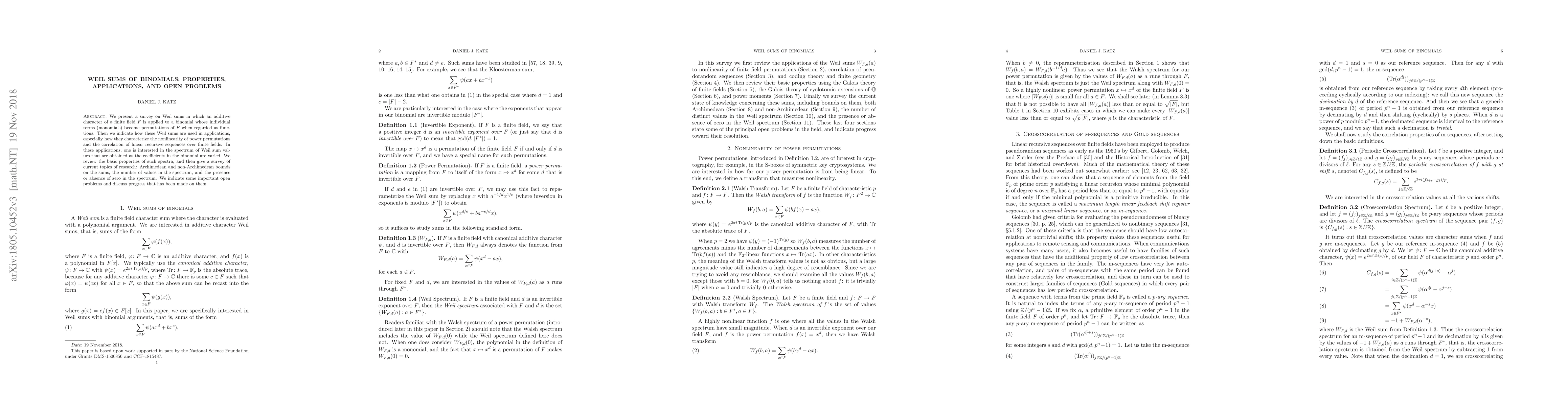 This paper surveys Weil sums applied to binomials in finite fields, highlighting their role in characterizing nonlinearity and sequence correlations. It reviews properties of these sums, discusses current research on bounds and spectrum, and outlines significant open problems in the field.