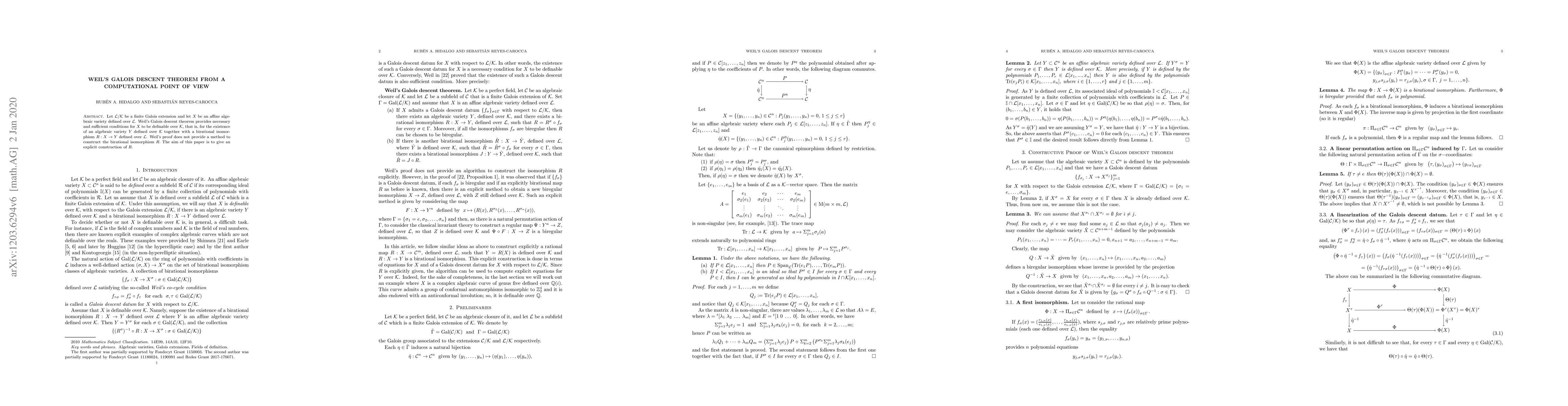 Let ${\mathcal L}/{\mathcal K}$ be a finite Galois extension and let $X$ be an affine algebraic variety defined over ${\mathcal L}$. Weil's Galois descent theorem provides necessary and sufficient conditions for $X$ to be definable over ${\mathcal K}$, that is, for the existence of an algebraic variety $Y$ defined over ${\mathcal K}$ together with a birational isomorphism $R:X \to Y$ defined over ${\mathcal L}$. Weil's proof does not provide a method to construct the birational isomorphism $R.$ The aim of this paper is to give an explicit construction of $R$.