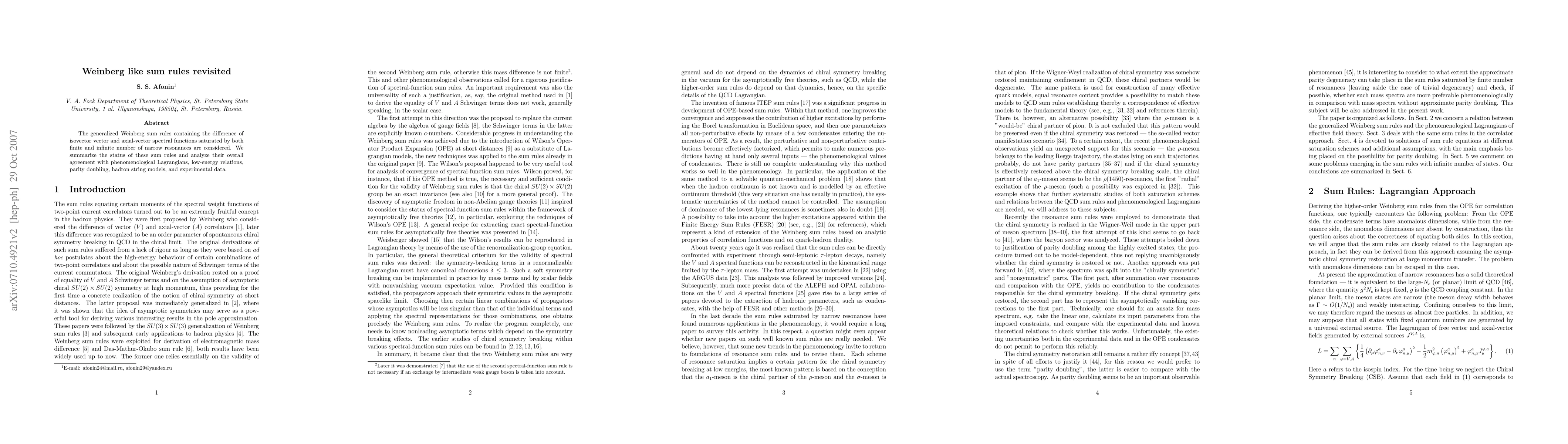 This paper revisits the generalized Weinberg sum rules, focusing on the spectral functions involving vector and axial-vector resonances. It evaluates the consistency of these sum rules with various theoretical frameworks and experimental data.