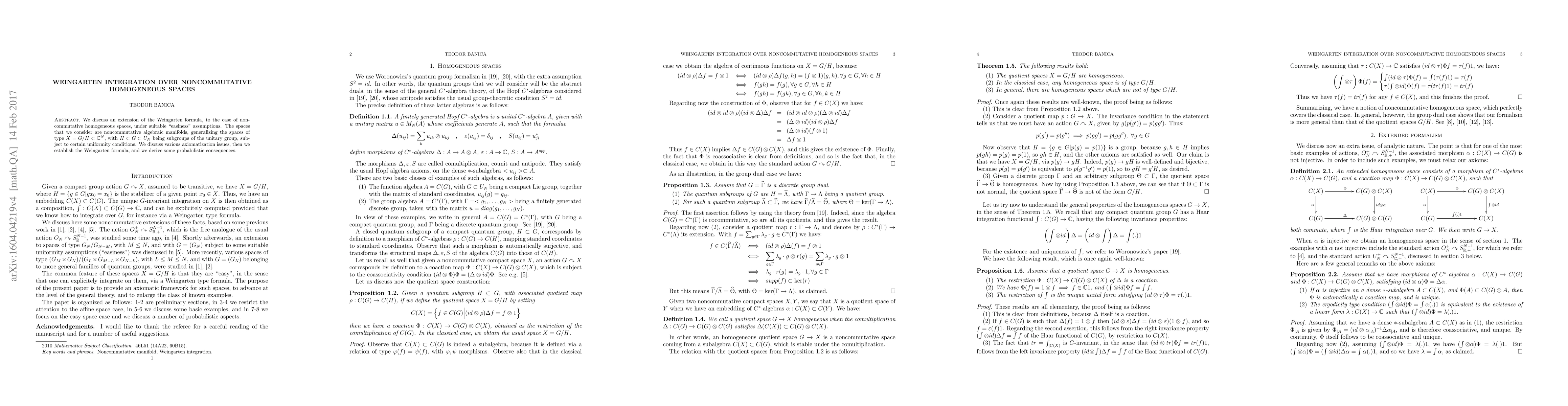 This paper extends the Weingarten formula to noncommutative homogeneous spaces, focusing on noncommutative algebraic manifolds. It addresses axiomatization issues and derives probabilistic consequences under specific conditions.