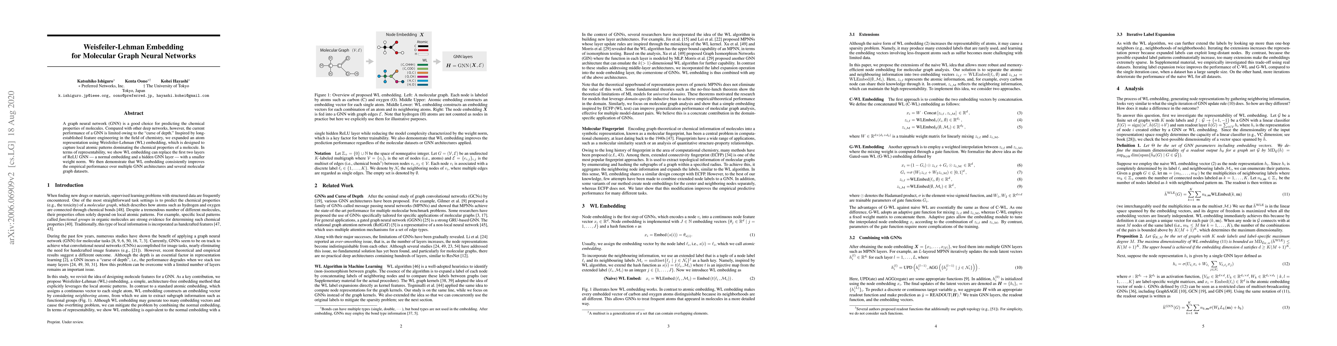A graph neural network (GNN) is a good choice for predicting the chemical properties of molecules. Compared with other deep networks, however, the current performance of a GNN is limited owing to the "curse of depth." Inspired by long-established feature engineering in the field of chemistry, we expanded an atom representation using Weisfeiler-Lehman (WL) embedding, which is designed to capture local atomic patterns dominating the chemical properties of a molecule. In terms of representability, we show WL embedding can replace the first two layers of ReLU GNN -- a normal embedding and a hidden GNN layer -- with a smaller weight norm. We then demonstrate that WL embedding consistently improves the empirical performance over multiple GNN architectures and several molecular graph datasets.