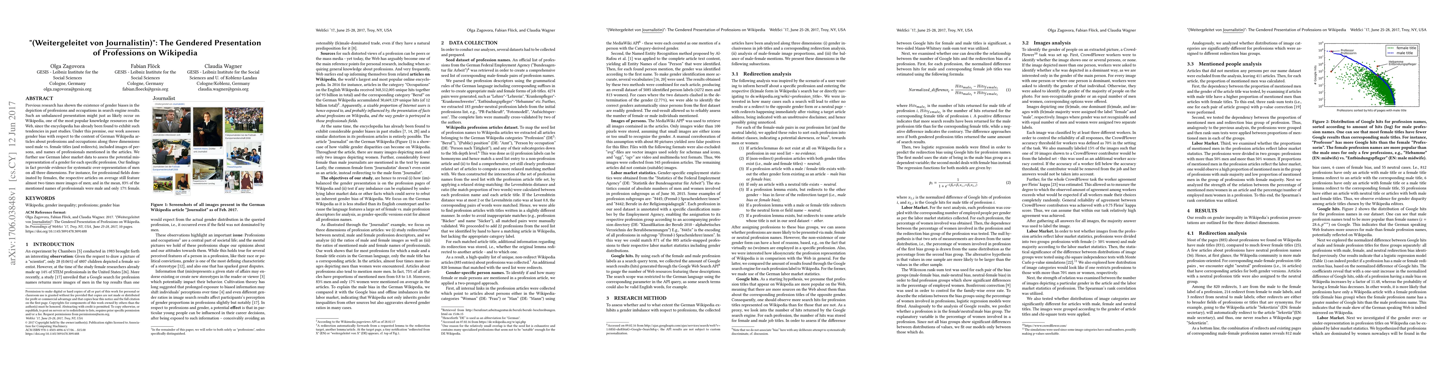 This study investigates gender biases in German Wikipedia articles on professions, finding systematic over-representation of men in terms of male vs. female titles, images of persons, and mentioned professionals. Despite female dominance in certain fields, articles still feature more male-oriented content.
