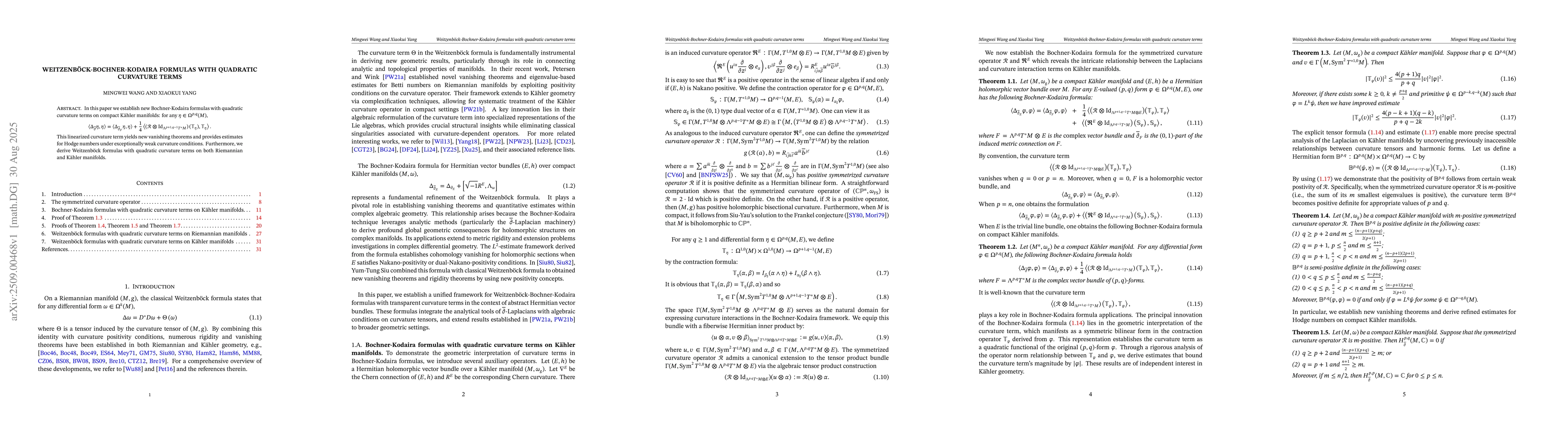 In this paper we establish new Bochner-Kodaira formulas with quadratic curvature terms on compact K\"ahler manifolds: for any $\eta\in \Omega^{p,q}(M)$, $$ \left\langle\Delta_{\overline \partial} \eta,\eta\right\rangle =\left\langle \Delta_{{\overline\partial}_F} \eta,\eta\right\rangle +\frac{1}{4}\left\langle \left(\mathcal {R} \otimes \mathrm{Id}_{\Lambda^{p+1,q-1}T^*M}\right)(\mathbb T_\eta),\mathbb T_\eta \right\rangle. $$ This linearized curvature term yields new vanishing theorems and provides estimates for Hodge numbers under exceptionally weak curvature conditions. Furthermore, we derive Weitzenb\"ock formulas with quadratic curvature terms on both Riemannian and K\"ahler manifolds.