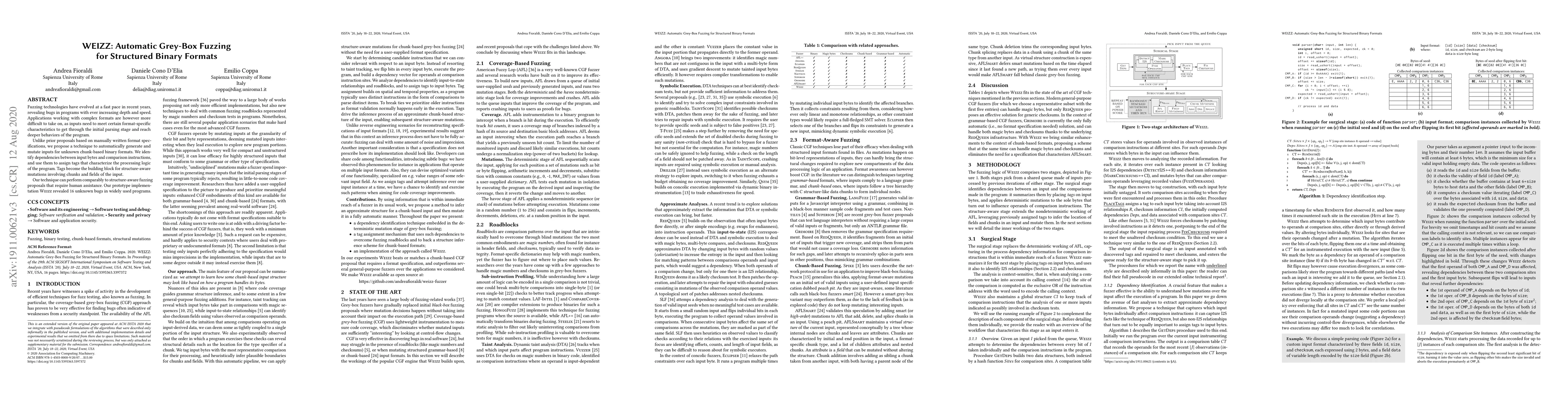 Fuzzing technologies have evolved at a fast pace in recent years, revealing bugs in programs with ever increasing depth and speed. Applications working with complex formats are however more difficult to take on, as inputs need to meet certain format-specific characteristics to get through the initial parsing stage and reach deeper behaviors of the program. Unlike prior proposals based on manually written format specifications, in this paper we present a technique to automatically generate and mutate inputs for unknown chunk-based binary formats. We propose a technique to identify dependencies between input bytes and comparison instructions, and later use them to assign tags that characterize the processing logic of the program. Tags become the building block for structure-aware mutations involving chunks and fields of the input. We show that our techniques performs comparably to structure-aware fuzzing proposals that require human assistance. Our prototype implementation WEIZZ revealed 16 unknown bugs in widely used programs.