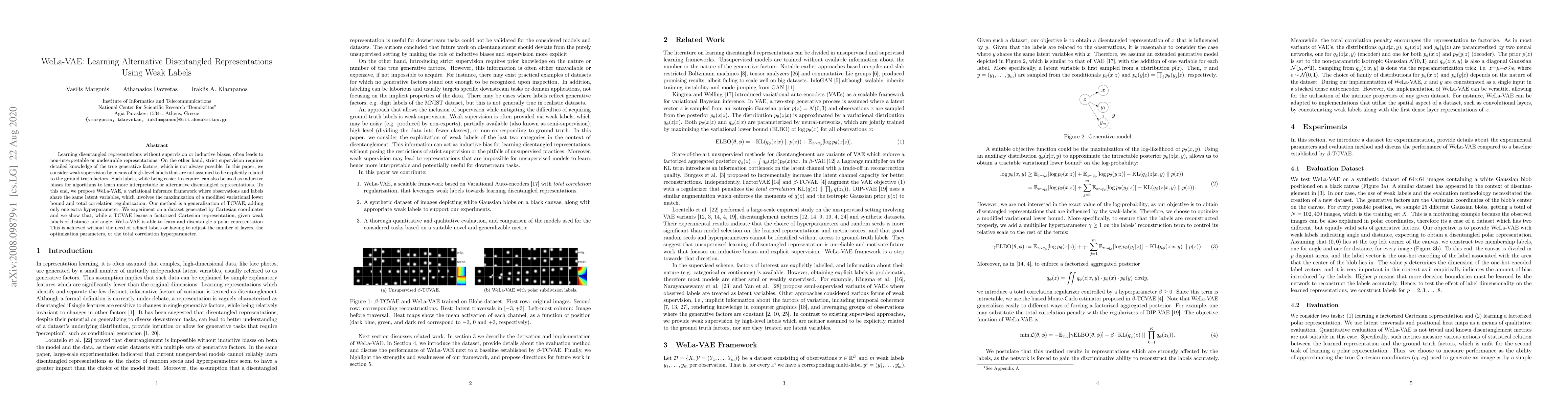 The paper proposes WeLa-VAE, a variational framework that uses weak labels to learn alternative disentangled representations, demonstrating its ability to learn a polar representation from Cartesian coordinates using only distance and angle labels. Unlike TCVAE, WeLa-VAE requires no adjustments to model architecture or hyperparameters.