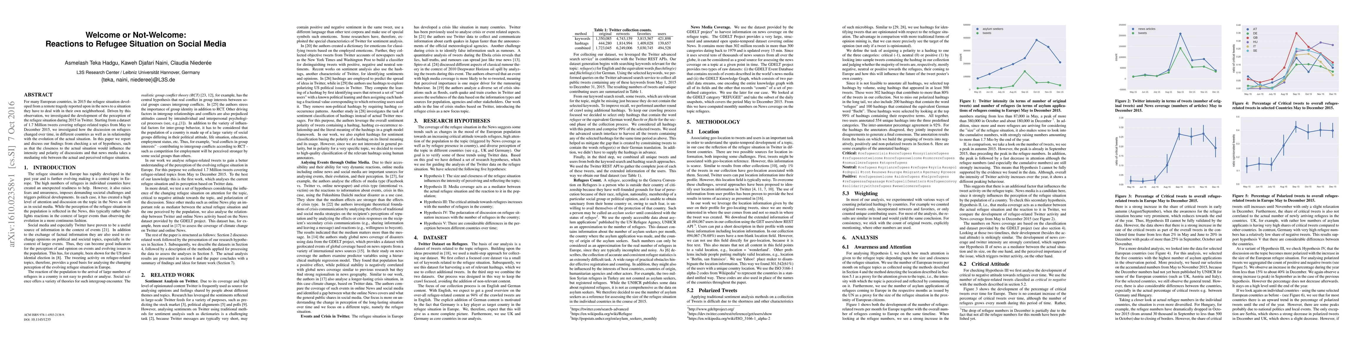 This study analyzes 1.7 million tweets from May to December 2015 regarding the refugee situation in Europe, examining how public perception evolved over time and across countries. The research found that proximity to the refugee crisis influenced the intensity and tone of discussions, with media playing a significant role in shaping public perception.