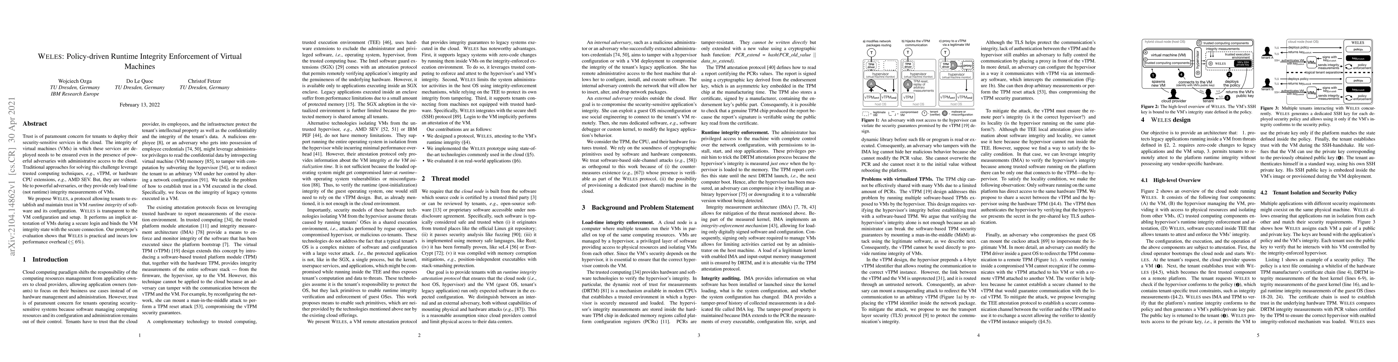 WELES introduces a protocol for policy-driven runtime integrity enforcement of virtual machines, combining software-based TPM emulation with TEE-based remote attestation to ensure VM integrity without requiring tenant-specific hardware.