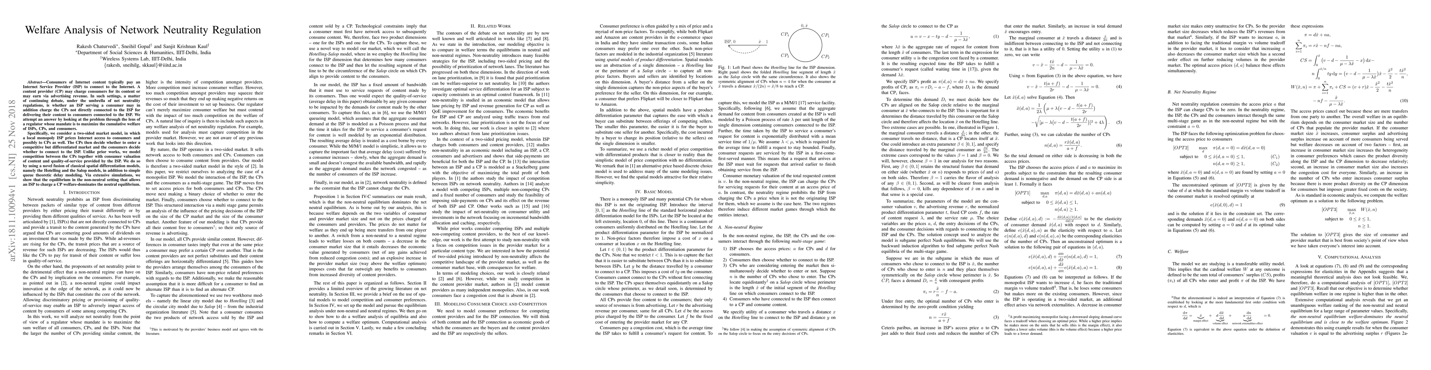 Consumers of Internet content typically pay an Internet Service Provider (ISP) to connect to the Internet. A content provider (CP) may charge consumers for its content or may earn via advertising revenue. In such settings, a matter of continuing debate, under the umbrella of net neutrality regulations, is whether an ISP serving a consumer may in addition charge the CPs not directly connected to the ISP for delivering their content to consumers connected to the ISP. We attempt an answer by looking at the problem through the lens of a regulator whose mandate is to maximize the cumulative welfare of ISPs, CPs, and consumers. Specifically, we consider a two-sided market model, in which a local monopoly ISP prices Internet access to consumers and possibly to CPs as well. The CPs then decide whether to enter a competitive but differentiated market and the consumers decide whether to connect to the ISP. Unlike prior works, we model competition between the CPs together with consumer valuation of content and quality-of-service provided by the ISP. We do so by using a novel fusion of classical spatial differentiation models, namely the Hotelling and the Salop models, in addition to simple queue theoretic delay modeling. Via extensive simulations, we show that the equilibrium in the non-neutral setting that allows an ISP to charge a CP welfare-dominates the neutral equilibrium.