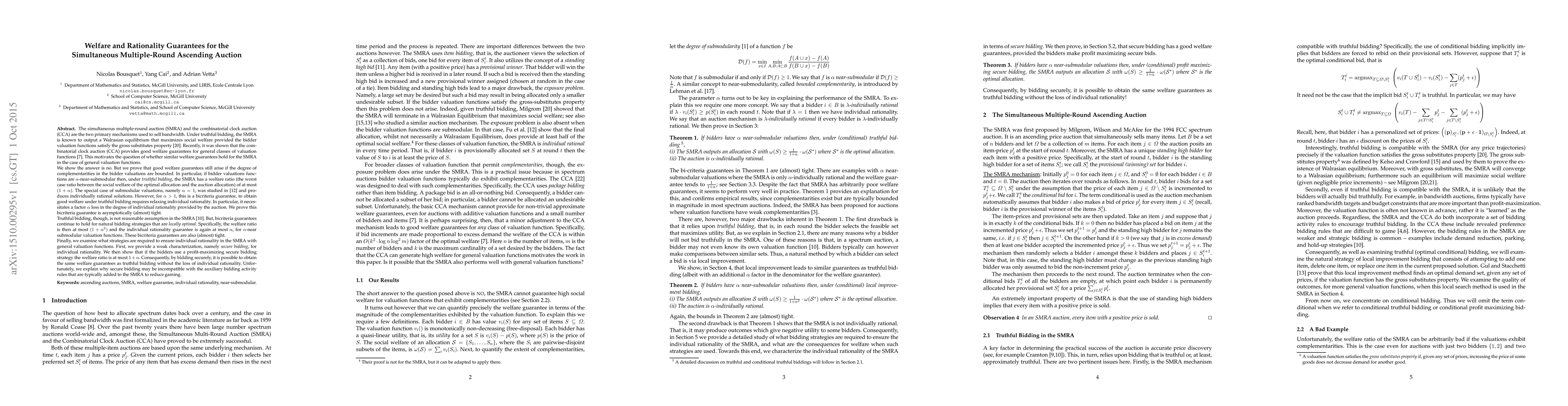 The simultaneous multiple-round auction (SMRA) and the combinatorial clock auction (CCA) are the two primary mechanisms used to sell bandwidth. Under truthful bidding, the SMRA is known to output a Walrasian equilibrium that maximizes social welfare provided the bidder valuation functions satisfy the gross substitutes property. Recently, it was shown that the combinatorial clock auction (CCA) provides good welfare guarantees for general classes of valuation functions. This motivates the question of whether similar welfare guarantees hold for the SMRA in the case of general valuation functions. We show the answer is no. But we prove that good welfare guarantees still arise if the degree of complementarities in the bidder valuations are bounded. In particular, if bidder valuations functions are $\alpha$-near-submodular then, under truthful bidding, the SMRA has a welfare ratio (the worst case ratio between the social welfare of the optimal allocation and the auction allocation) of at most $(1+\alpha)$. The special case of submodular valuations, namely $\alpha=1$, and produces individually rational solutions. However, for $\alpha>1$, this is a bicriteria guarantee, to obtain good welfare under truthful bidding requires relaxing individual rationality. Finally, we examine what strategies are required to ensure individual rationality in the SMRA with general valuation functions. First, we provide a weak characterization, namely \emph{secure bidding}, for individual rationality. We then show that if the bidders use a profit-maximizing secure bidding strategy the welfare ratio is at most $1+\alpha$. Consequently, by bidding securely, it is possible to obtain the same welfare guarantees as truthful bidding without the loss of individual rationality.
