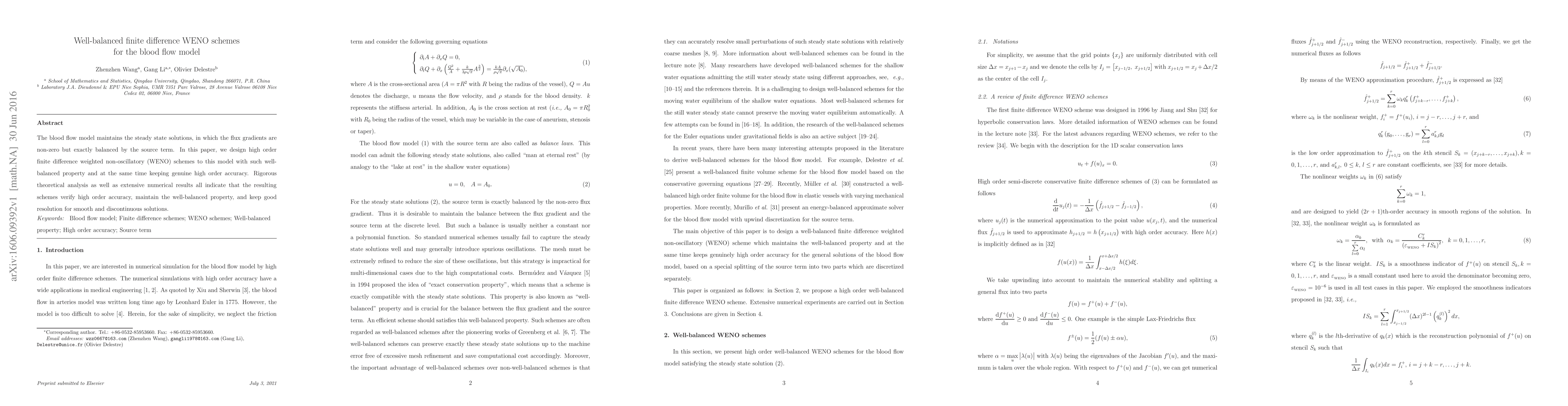 This paper develops high-order finite difference WENO schemes for a blood flow model that maintains steady state with balanced flux gradients and source terms. The proposed schemes achieve high accuracy, preserve the well-balanced property, and effectively resolve both smooth and discontinuous solutions.