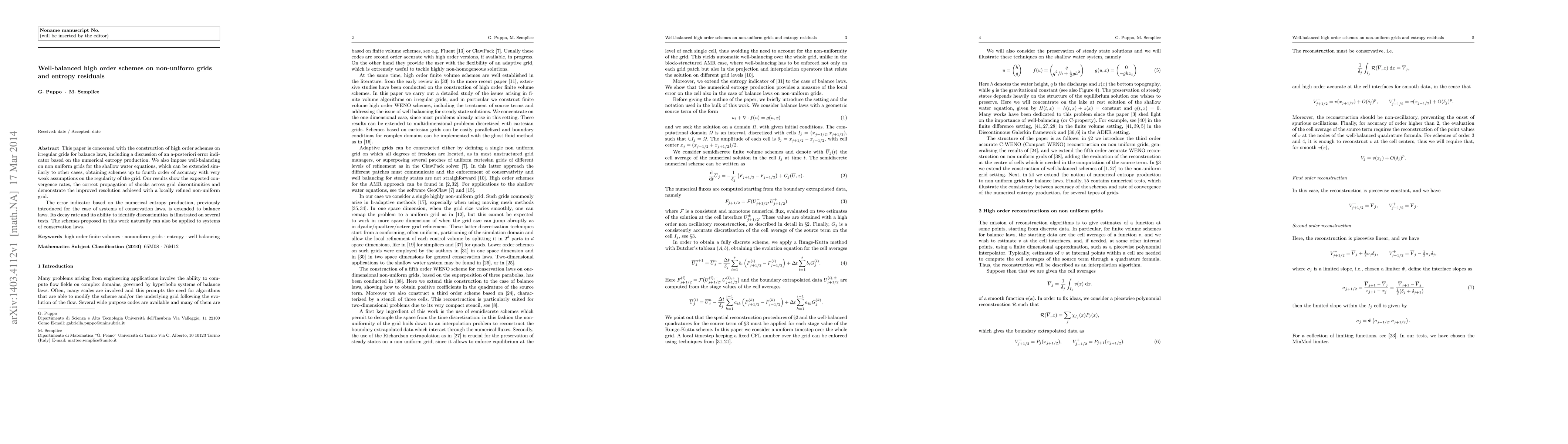 This paper develops high-order schemes for balance laws on non-uniform grids, introducing an error indicator based on numerical entropy production. It achieves well-balancing for the shallow water equations and demonstrates the schemes' accuracy and shock propagation, with convergence rates and improved resolution on locally refined grids.