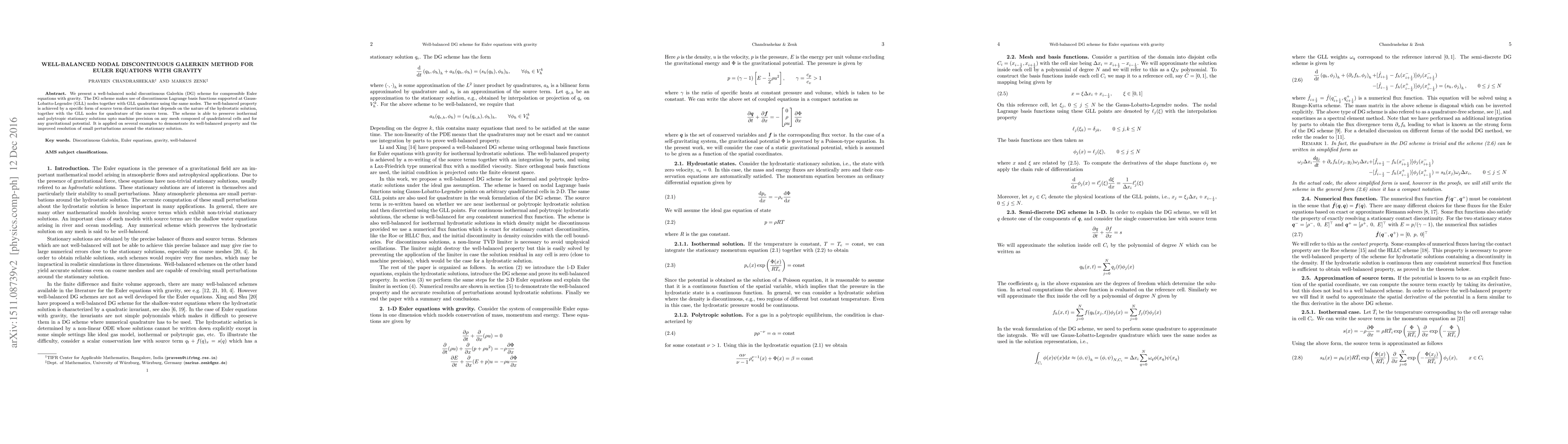 This paper introduces a well-balanced nodal discontinuous Galerkin method for solving compressible Euler equations with gravity, utilizing Gauss-Lobatto-Legendre nodes and quadrature. The method preserves stationary solutions with high precision and demonstrates improved resolution of small perturbations.
