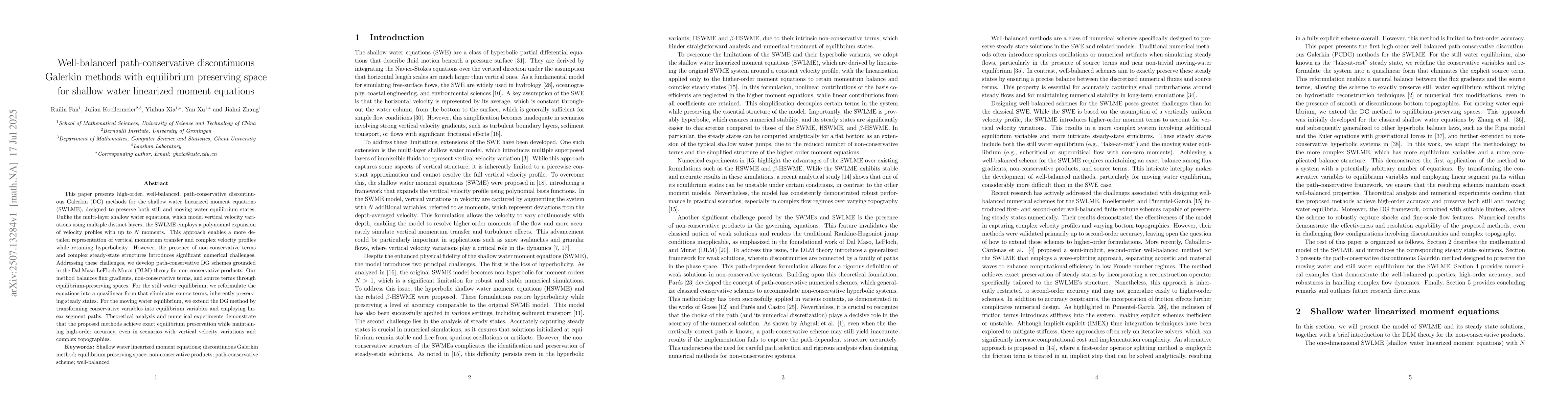 The paper develops high-order, well-balanced, path-conservative discontinuous Galerkin (DG) methods for shallow water linearized moment equations (SWLME), designed to preserve both still and moving water equilibrium states. These methods are based on Dal Maso-LeFloch-Murat (DLM) theory for non-conservative products, ensuring exact equilibrium preservation while maintaining high-order accuracy.