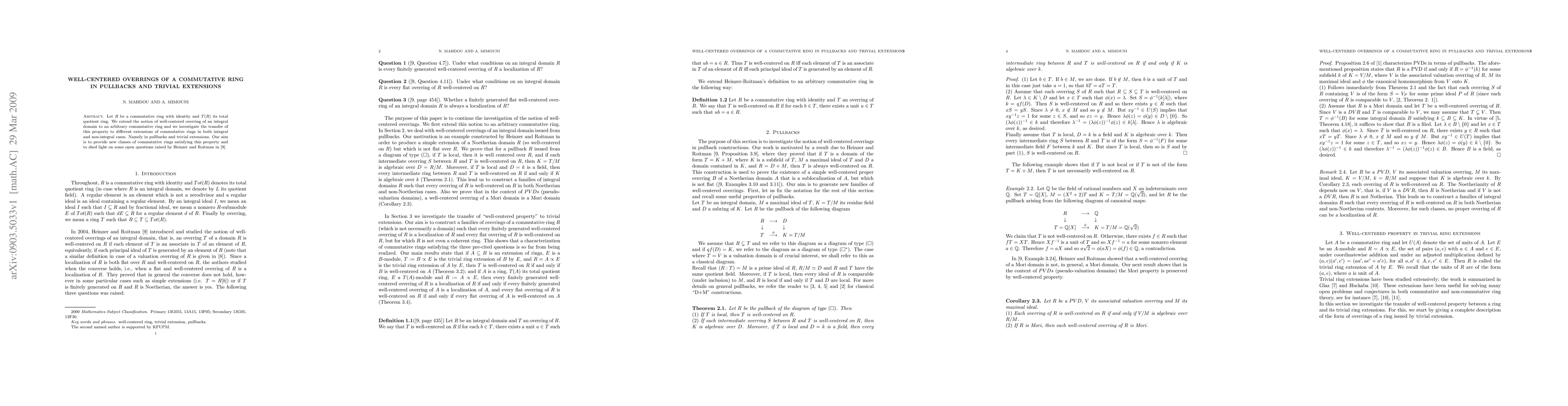 This paper extends the concept of well-centered overrings to arbitrary commutative rings and examines how this property transfers in pullbacks and trivial extensions. It aims to identify new classes of commutative rings with this property and address open questions posed by Heinzer and Roitman.