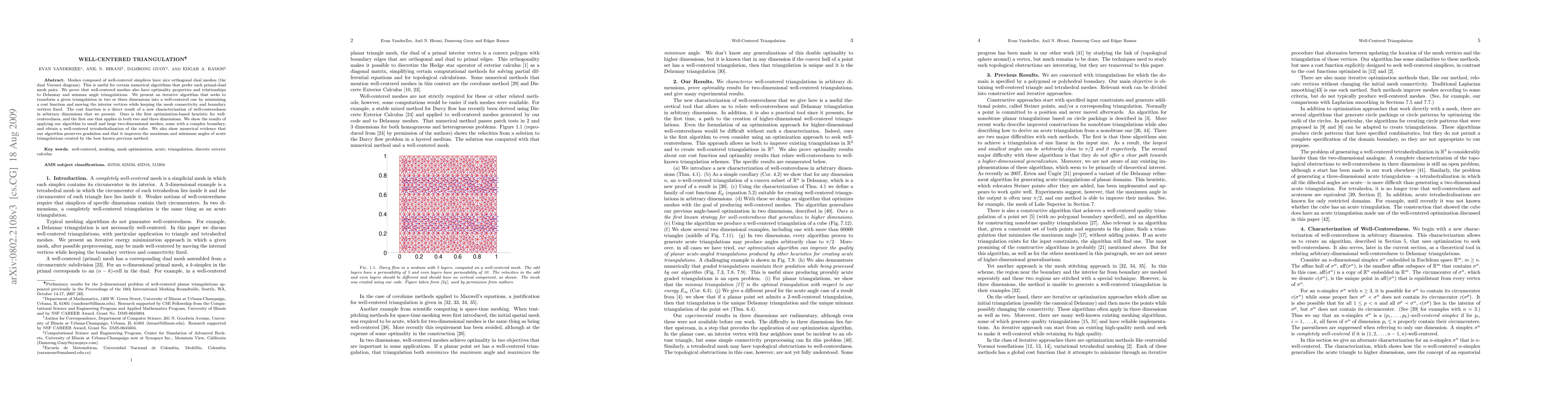 Meshes composed of well-centered simplices have nice orthogonal dual meshes (the dual Voronoi diagram). This is useful for certain numerical algorithms that prefer such primal-dual mesh pairs. We prove that well-centered meshes also have optimality properties and relationships to Delaunay and minmax angle triangulations. We present an iterative algorithm that seeks to transform a given triangulation in two or three dimensions into a well-centered one by minimizing a cost function and moving the interior vertices while keeping the mesh connectivity and boundary vertices fixed. The cost function is a direct result of a new characterization of well-centeredness in arbitrary dimensions that we present. Ours is the first optimization-based heuristic for well-centeredness, and the first one that applies in both two and three dimensions. We show the results of applying our algorithm to small and large two-dimensional meshes, some with a complex boundary, and obtain a well-centered tetrahedralization of the cube. We also show numerical evidence that our algorithm preserves gradation and that it improves the maximum and minimum angles of acute triangulations created by the best known previous method.