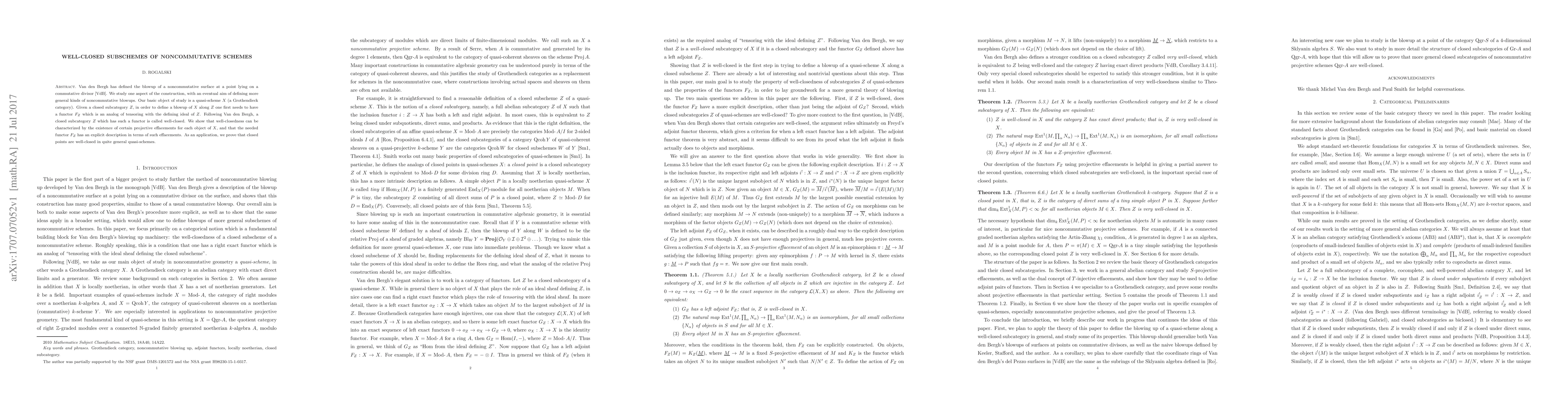Van den Bergh has defined the blowup of a noncommutative surface at a point lying on a commutative divisor. We study one aspect of the construction, with an eventual aim of defining more general kinds of noncommutative blowups. Our basic object of study is a quasi-scheme X (a Grothendieck category). Given a closed subcategory Z, in order to define a blowup of X along Z one first needs to have a functor F which is an analog of tensoring with the defining ideal of Z. Following Van den Bergh, a closed subcategory Z which has such a functor is called well-closed. We show that well-closedness can be characterized by the existence of certain projective effacements for each object of X, and that the needed functor F has an explicit description in terms of such effacements. As an application, we prove that closed points are well-closed in quite general quasi-schemes.