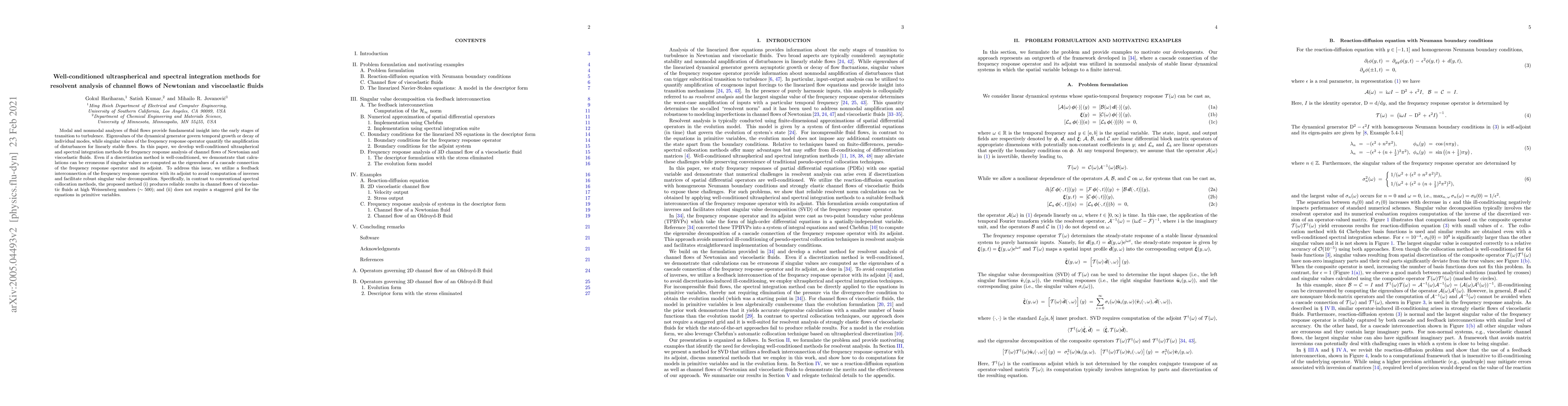 This paper develops well-conditioned ultraspherical and spectral integration methods for analyzing the dynamic response of channel flows in Newtonian and viscoelastic fluids. The proposed method avoids erroneous singular value computations and provides reliable results for high Weissenberg numbers without requiring a staggered grid.