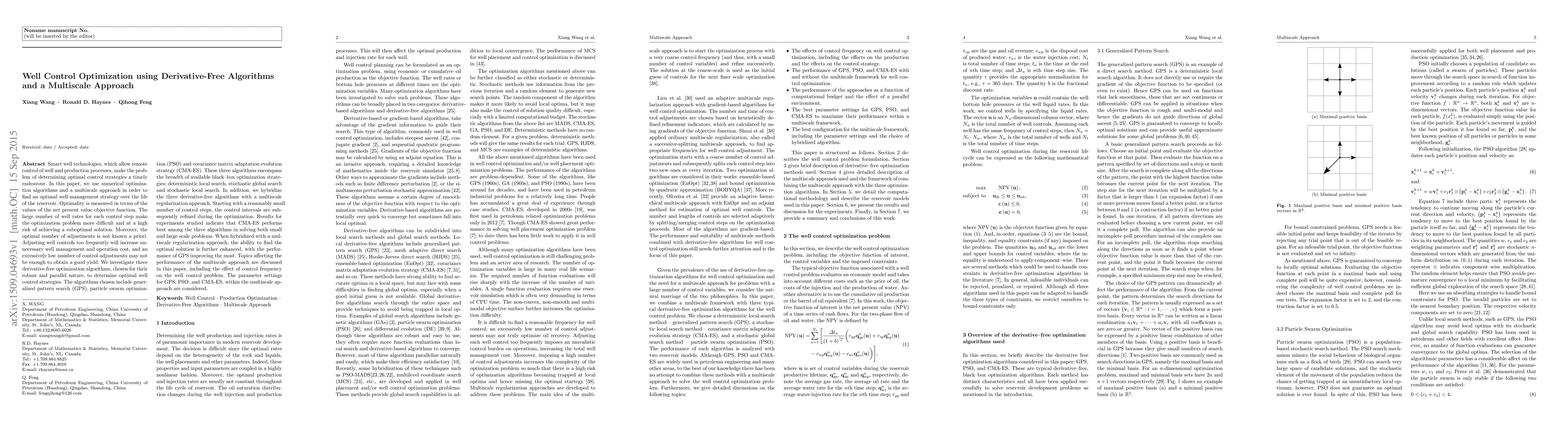 This paper explores the optimization of well management strategies using derivative-free algorithms and a multiscale approach to avoid suboptimal solutions and manage operational costs. The study compares GPS, PSO, and CMA-ES, finding CMA-ES most effective, especially when hybridized with a multiscale regularization approach that refines control intervals progressively.