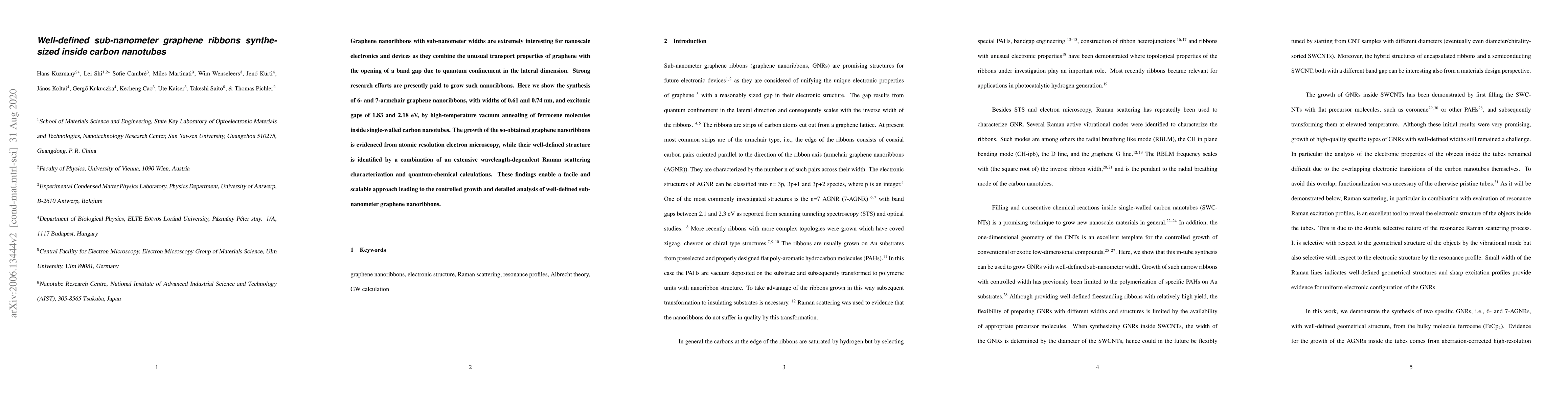 This paper reports the synthesis of 6- and 7-armchair graphene nanoribbons with sub-nanometer widths inside carbon nanotubes via high-temperature vacuum annealing of ferrocene. The ribbons exhibit unique electronic properties due to quantum confinement, validated by electron microscopy and Raman scattering.