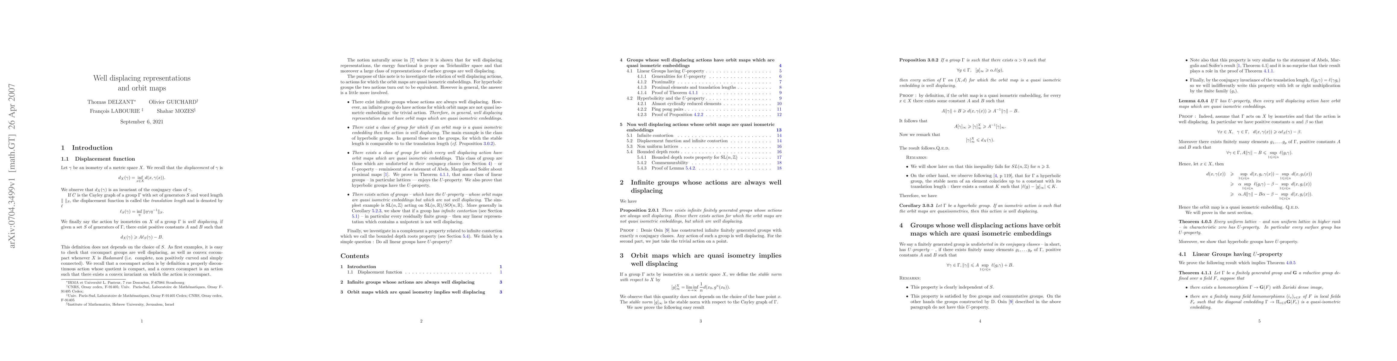 We discuss in this article a property of action of groups by isometries called "well displacing". An action is said to be well displacing, if the displacement function is equivalent to the the displacement function for the action on the Cayley graph. We relate this property with the fact that orbit maps are quasi-isometric embeddings. We first describe countrexamples that shows this two notions are unrelated in general. On the other hand we explain that for a certain class of groups -- in particular hyperbolic groups -- these two properties are equivalent. In the course of our discussion, we introduce an intrinsic property of the group -- that we called the U-property -- which says quantitatively how the norm an element is controlled by the translation length of finitely many related conjugacy classes. This property play a central role in our discussion.