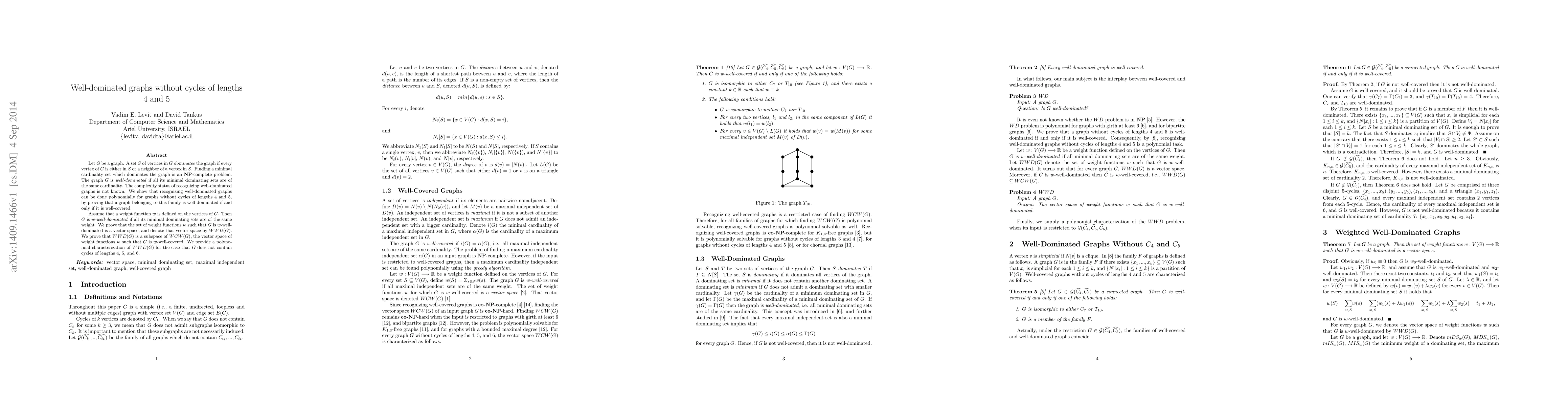 The paper establishes a polynomial recognition algorithm for well-dominated graphs without cycles of lengths 4 and 5, and proves that the set of weight functions WWD(G) forms a vector space.