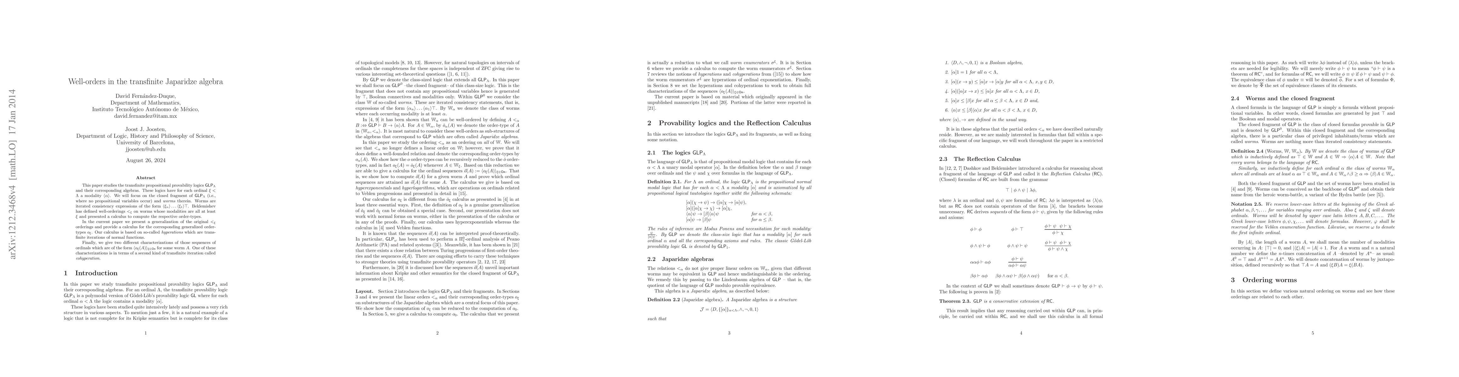 This paper studies well-orders in the transfinite Japaridze algebra, a mathematical logic framework, and provides a calculus for computing generalized order-types based on hyperations, offering new insights into sequences of ordinals related to worm expressions.