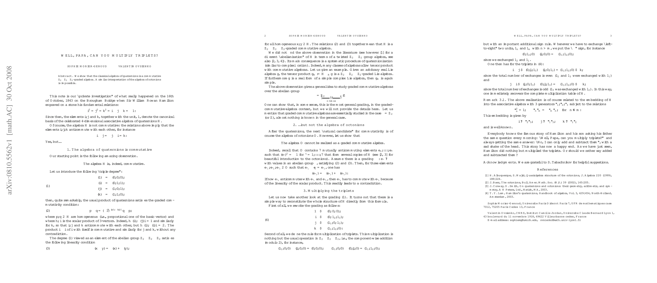 We show that the classical algebra of quaternions is a commutative $\Z_2\times\Z_2\times\Z_2$-graded algebra. A similar interpretation of the algebra of octonions is impossible.